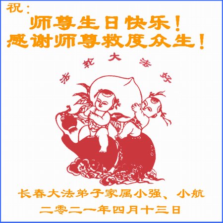 法轮大法好!真善忍好! 吉林省长春大法弟子家属敬上 二零二一年四月二十八日 吉林省长春大法弟子二人学法小组庆贺大法洪传,恭祝慈悲伟大的师尊生日快乐!