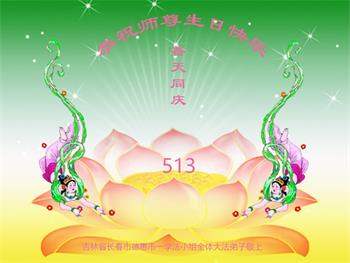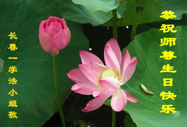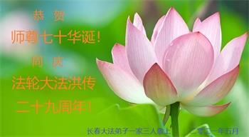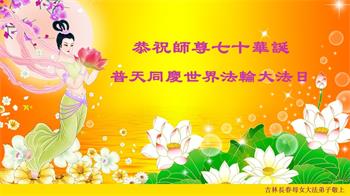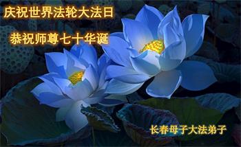 大法洪传, 普济众生。 师尊华诞, 普天同庆。值此师尊七十华诞暨第22届世界法轮大法日之际,长春市母女大法弟子恭祝师尊生日快乐!同贺世界法轮大法日!感恩师尊慈悲苦度,叩拜! 吉林省长春大法弟子恭祝师尊生日快乐!