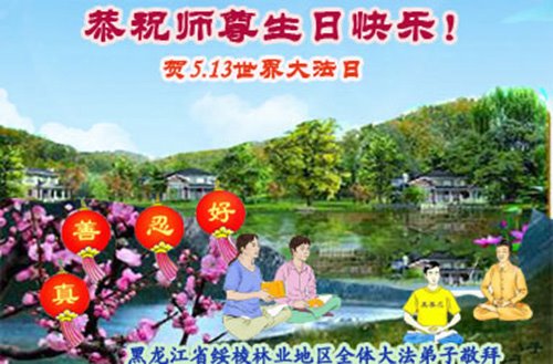 黑龙江省绥棱林业地区全体大法弟子恭祝师尊生日快乐!祝贺世界法轮大法日!