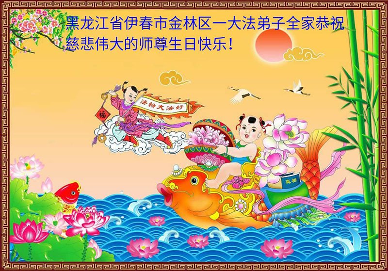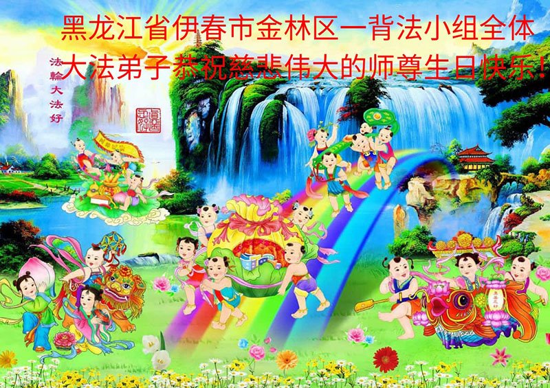 师尊您辛苦了!感谢师尊的救度之恩!弟子尽全力做好三件事,修去各种执着心,助师正法,完成史前大愿,跟师尊回家。 黑龙江省伊春市金林区一背法小组全体大法弟子恭祝慈悲伟大的师尊生日快乐!恭贺世界法轮大法日!
