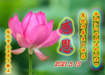【明慧网二零二一年五月十三日】 黑龙江省七台河市勃利县铁西一大法弟子恭祝慈悲伟大的师尊生日快乐!