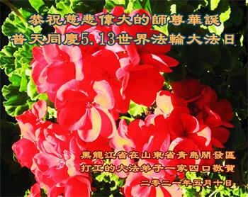 尊敬的师父,您好! 恭祝慈悲伟大的师尊生日快乐! 弟子回忆自己的修炼历程感慨万千,在慈悲伟大师父的保护下,走过了二十三个春秋。我们现在家庭和睦,一家人沐浴在师父的洪恩浩荡之中。 我代表全家人叩拜师尊!感恩师尊的慈悲保护与救度!弟子无法用语言表达师尊二十多年的慈悲苦度,只有精進、再精進,做好三件事,抓紧救人,跟师父回家! 历经万劫来世间 随师正法揭谎言 唤醒众生传真相 师尊度我回家园 黑龙江省勃利县铁西一大法弟子敬上 黑龙江在山东省青岛开发区打工的大法弟子一家四口恭祝慈悲伟大的师尊华诞!