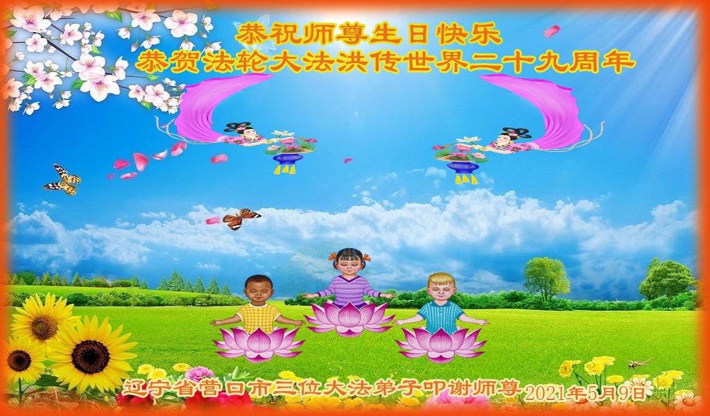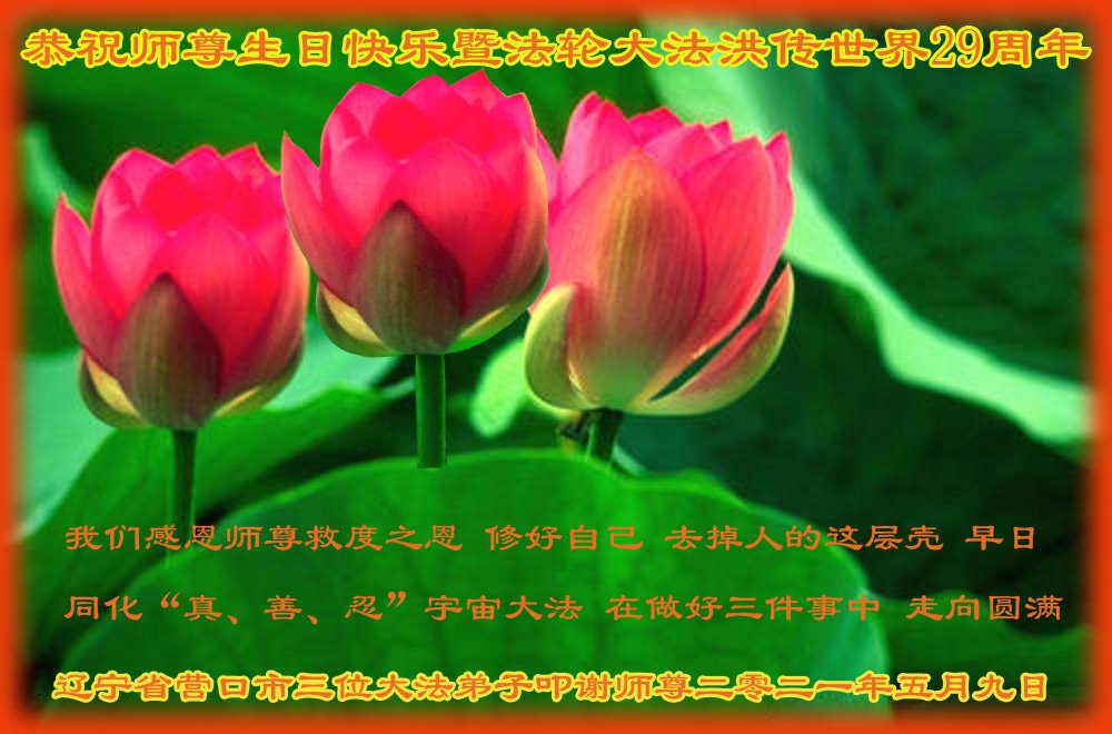 恭贺世界法轮大法日! 我们感恩师尊救度之恩!修好自己,去掉人的这层壳,早日同化“真、善、忍”宇宙大法,在做好“三件事”中走向圆满! 辽宁省营口市三位大法弟子恭祝师尊生日快乐!