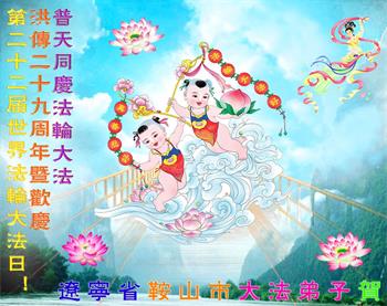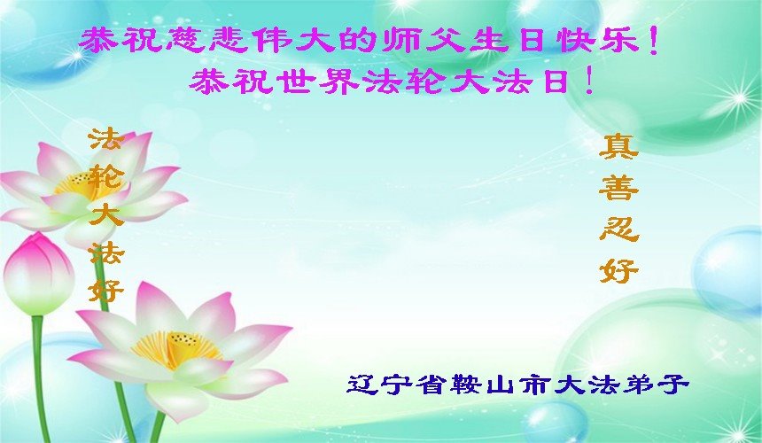 普天同庆世界法轮大法日! 恭祝慈悲伟大的师尊生日快乐! 在普天同庆世界法轮大法日之际,作为大法弟子,需牢记自己的使命,在有限的时间内,做好三件事,不辜负师尊的慈悲救度!圆满随师还! 慈悲伟大的师尊给予弟子们的是我们用生命的永远也无法表达。 祝愿全人类、全宇宙的救星——我们的师尊生日快乐! 辽宁省鞍山市大法弟子祝贺法轮大法洪传二十九周年!