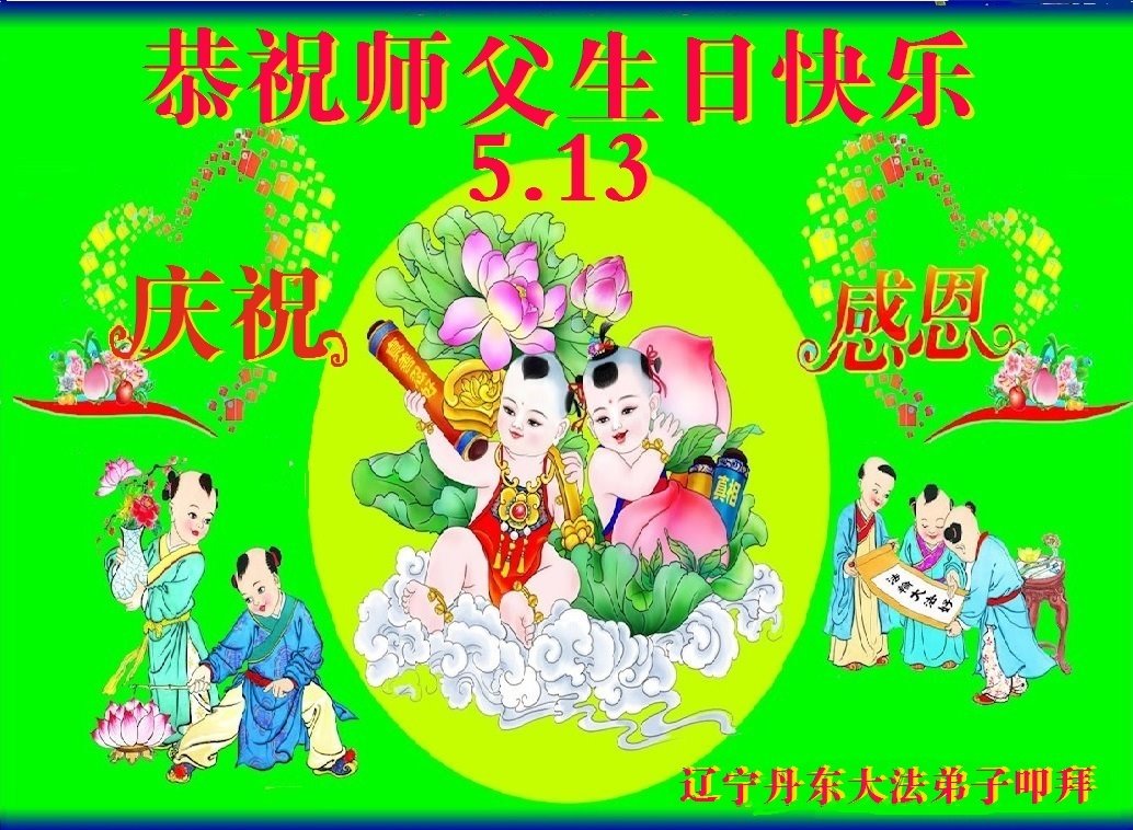 感恩的五月,五月的感恩!“五·一三”即将来临,此时此刻我们大法弟子无比感慨、喜悦,幸运和幸福!师尊将我们从地狱的污浊中救起,洗净,并赐予我们宇宙高德大法。看护、保护,精心的看护着我们,使我们一直走到今天成为助师正法弟子。师尊的洪大无量慈悲、师尊的浩荡洪恩用尽人间的语言也无以表达、无以报答!唯有遵循师尊教诲,珍惜这万古难寻的修炼机缘,在时间所剩不多的瞬间里,努力的多学法学好法,学法得法,同化大法。向内找修心性提高自己。真正的从内在上改变自己。做到真修、实修。做好三件事,收救有缘众生。将法轮大法的美好和“真善忍”的普世价值留给世人。完成使命随师尊回家! 跪拜师尊! 辽宁丹东大法弟子庆祝法轮大法日!恭祝师父生日快乐!