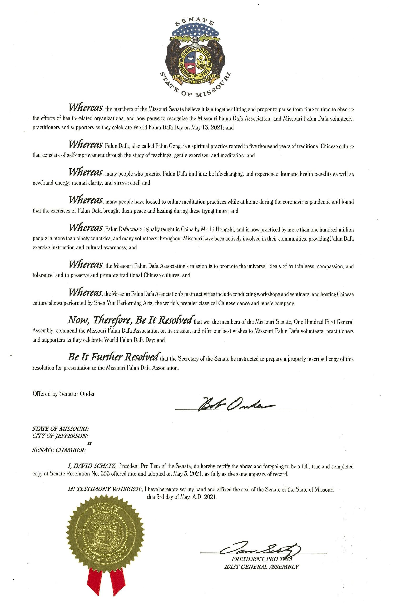 | 【明慧网二零二一年五月十四日】二零二一年五月十三日是第二十二届世界法轮大法日,也是法轮大法弘传世界二十九周年。美国密苏里州的参众两院分别以决议的方式,祝贺法轮大法日。 密苏里州参议院的决议由鲍勃·奥德(Bob Onder)议员发起,表示“我们密苏里州参议院第一百零一届议会的议员们,向密苏里州法轮大法学会在过去取得的成就表示祝贺。值此庆祝世界法轮大法日之际,请接受来自此届议会所有人员向密苏里州法轮大法学会的义工、学员和支持者最衷心的祝福。”  图1:密苏里州参议院决议案 |