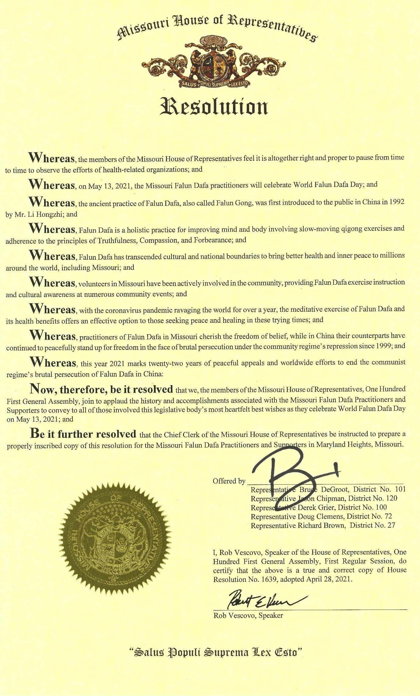 以下是密苏里州众议院决议案译文。 鉴于,密苏里州众议院的议员们认为应该适当的表彰和健康相关的有关机构;并且 鉴于,二零二一年五月十三日,密苏里州法轮大法修炼者庆祝世界法轮大法日;并且 鉴于,这套古老的修炼功法,法轮大法,又称法轮功,是由创始人李洪志先生在一九九二年在中国传出;并且 鉴于,法轮大法是能够整体提升人的身心健康的缓慢气功运动,并以真、善、忍的价值观为中心;并且 鉴于,法轮大法超越了文化及国家的界限,为全世界包括密苏里州在内的数以百万计的人们带来了健康和内心的平静;并且 鉴于,密苏里州的义工们一直积极参与大量社区活动,教授法轮大法的功法和增加文化意识;并且 鉴于,随着冠状病毒大流行席卷全球超过一年,法轮大法的冥想运动及其健康益处为那些在此艰难时期寻求和平与康复的人们提供了有效的选择;并且 鉴于,密苏里州的法轮大法修炼者珍视信仰自由,而他们在中国的同修从一九九九年至今,为了自由,面对中共的残酷镇压一直以来和平的反迫害;并且 鉴于,今年,二零二一年标志着第二十二年的和平呼吁停止对法轮功的残酷迫害和全球结束共产党政权的努力; 鉴此,我们,密苏里州众议院第一百零一届议会的议员们,向密苏里州法轮大法修炼者和支持者在过去取得的成就表示祝贺,向所有在五月十三日庆祝世界法轮大法日的人们表示最衷心最良好的祝愿。 决议案发起人: 布鲁斯·德格鲁特(Bruce DeGroot) 共同签署者: 杰森·奇普曼 (Jason Chipman) 德里克·格里尔(Derek Grier) 道格·克莱门斯(Doug Clemens) 理查德·布朗(Richard Brown)
