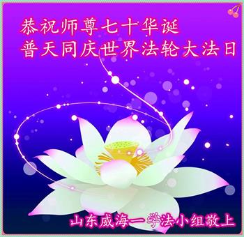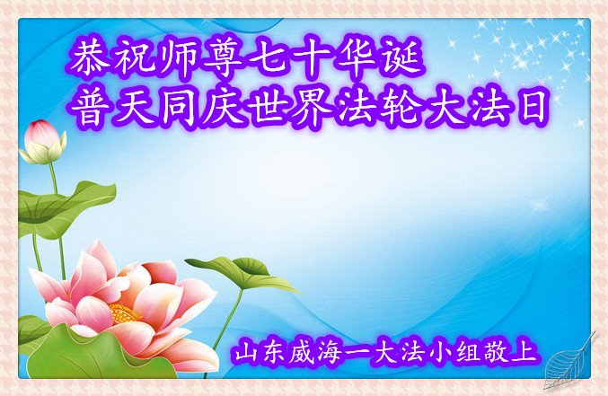 龙口一家三口大法弟子: 恭贺法轮大法日! 恭祝师尊生日快乐! 山东威海石岛两个学法小组大法弟子恭祝师尊生日快乐!