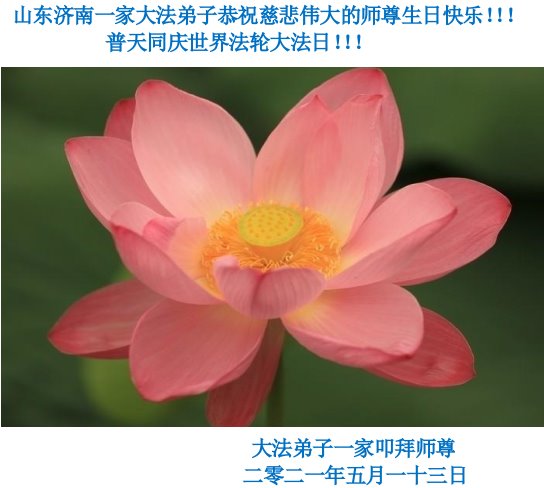恭贺世界法轮大法日! 感恩伟大的师尊对弟子的慈悲苦度。值此世界法轮大法日暨师尊七十岁华诞之日,弟子真诚祝愿师尊生日快乐!普天同庆这伟大的日子! 山东济南大法弟子全家普天同庆5.13世界法轮大法日!恭祝师父生日快乐!