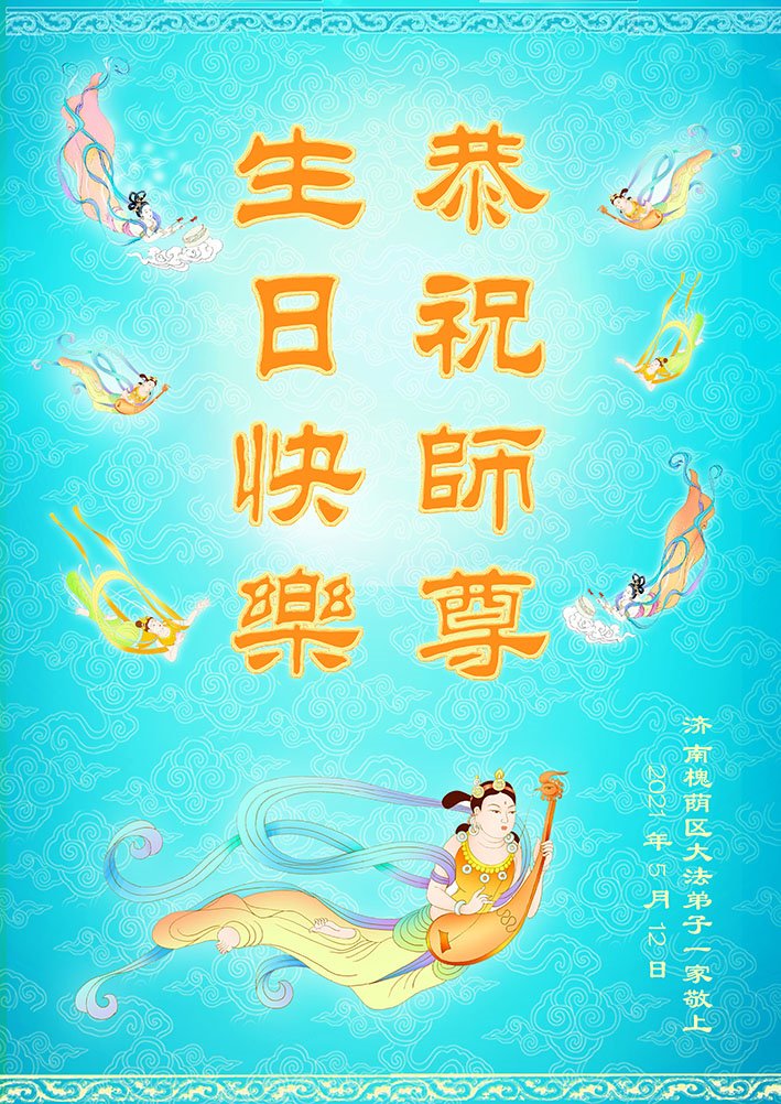 恭祝慈悲伟大师尊生日快乐! 庆祝法轮大法洪传二十九周年! 山东济南张庄路学法小组全体敬上 二零二一年五月十一日 山东济南大法弟子及全家人恭祝师尊生日快乐!