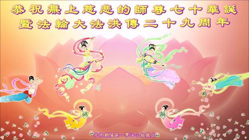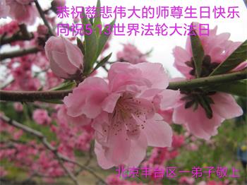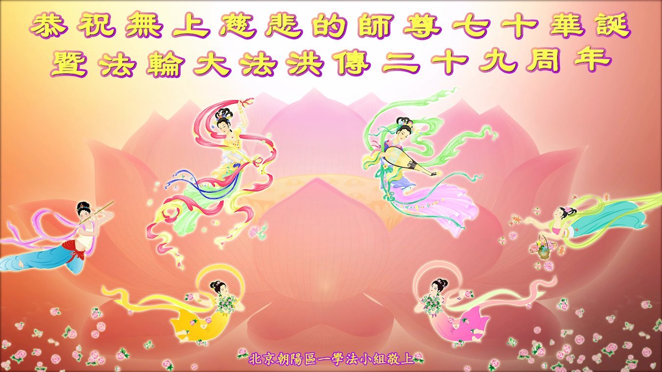 慈悲伟大的师尊: 我们虽然在修炼路上走的磕磕绊绊,但我们没有停下修炼的脚步,在不断的用大法对照自己一思一念、一言一行的每一天中,我们从开始的只为自己如何修炼、如何提高、如何有所收获,到现在慢慢的明白了,大法修炼是要我们修成没有自己,完全为他的生命。我们以前的修炼基点错了,所以修起来吃力又总是走弯路。慈悲的师父对我们无时无刻的看护与点悟,为我们苦心安排了每一关,使我们在一点点的纠正着修炼路的方向。虽然我们现在还没有做到无私无我,但我们在努力的背法,努力的同化大法,去掉以自我为中心的人心与观念,做一个真正的大法弟子,做一个无私为他的生命。 我们在互相督促着、提醒着、纠正着,一同奋力精進。 感谢无上慈悲的师尊对我们这不争气的弟子和我们的家人及众生的慈悲救度与无量承受,弟子们珍惜这万年不遇的修炼机缘,精進不怠,让师尊少为我们操心。 恭祝师尊七十华诞!弟子们叩拜师尊! 合十。 北京朝阳区一学法小组大法弟子敬上 北京丰台区大法弟子恭祝慈悲伟大的师尊生日快乐!恭祝5.13世界法轮大法日!