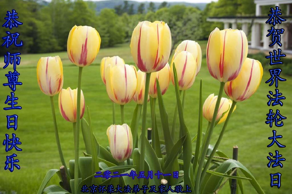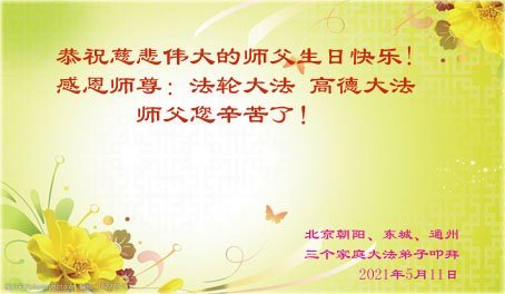 尊敬的师尊您好: 弟子和家母,恭祝您二零二一年生日快乐! 北京市石景山区法轮大法弟子和家母敬贺 二零二一年五月十三日 北京一学法小组大法弟子恭祝师尊生日快乐!恭祝世界法轮大法日!