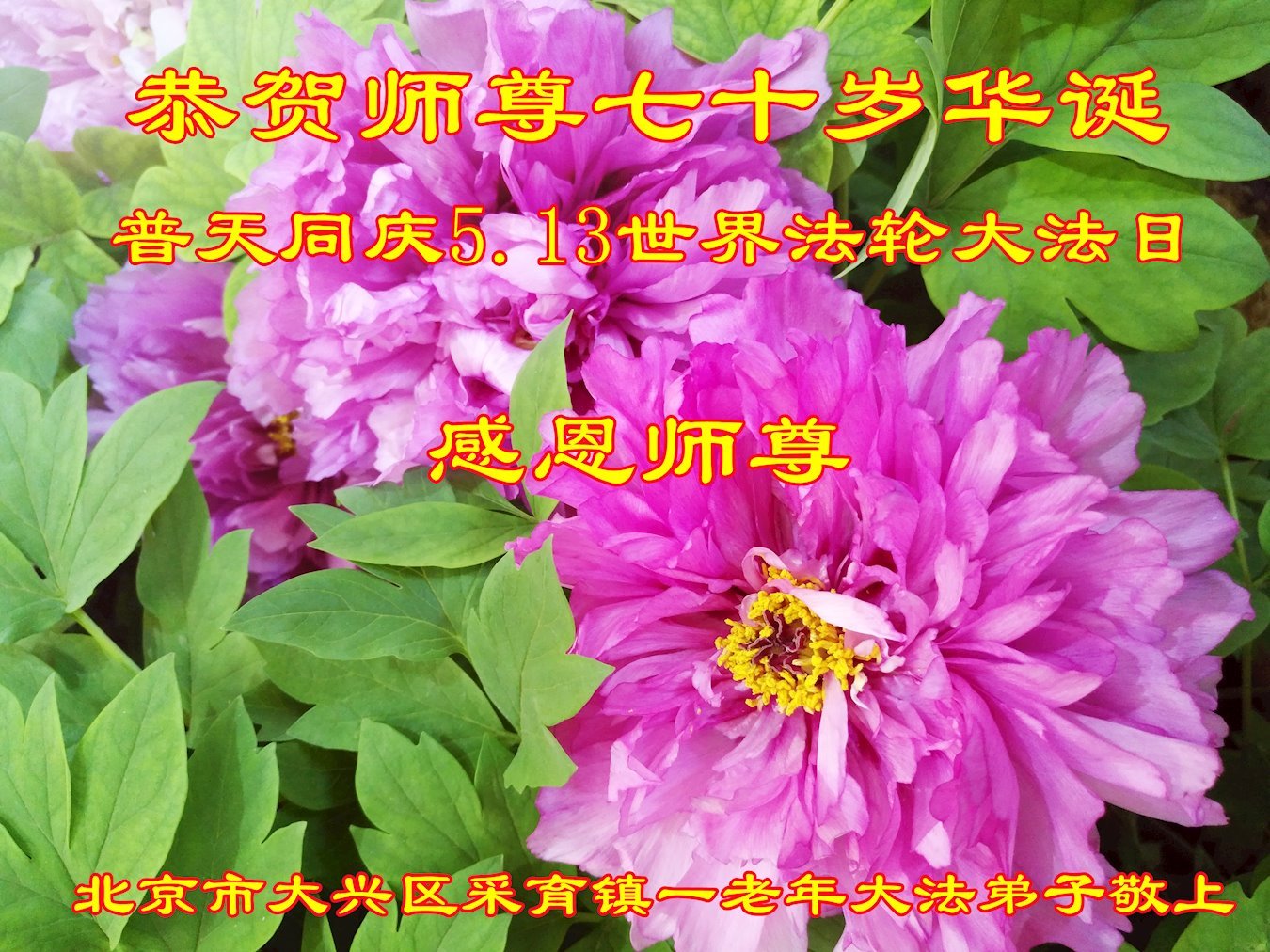法轮大法洪传29周年使众生得救人心向善道德回升,弟子永远跟着师父走,圆满随师还! 北京市大兴区采育镇一老年大法弟子恭祝师尊七十岁华诞!普天同庆5.13世界法轮大法日!