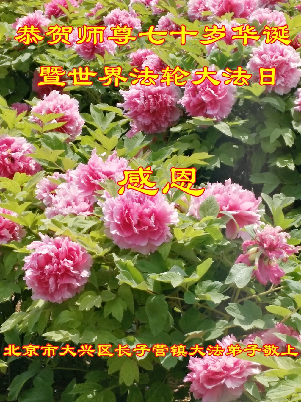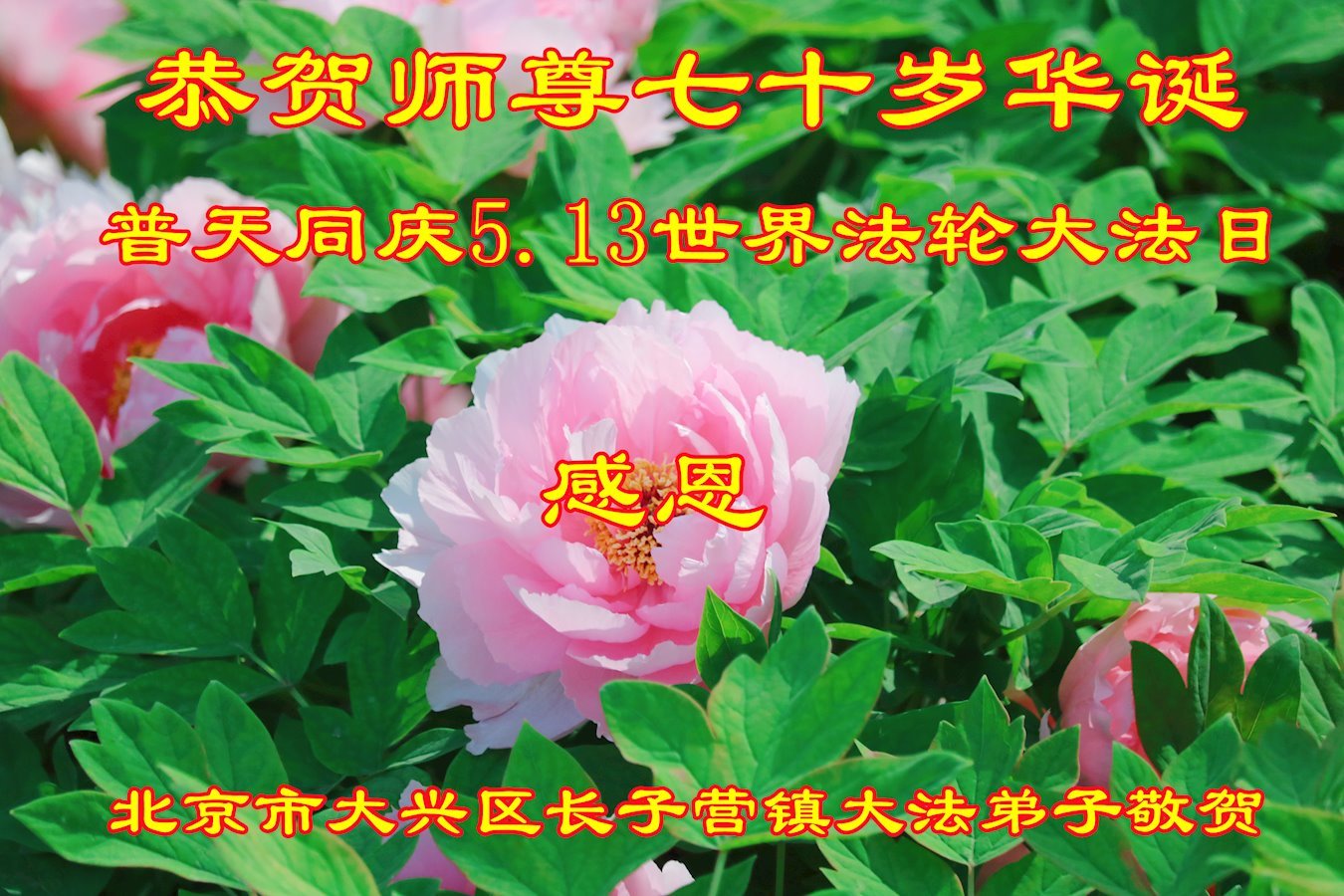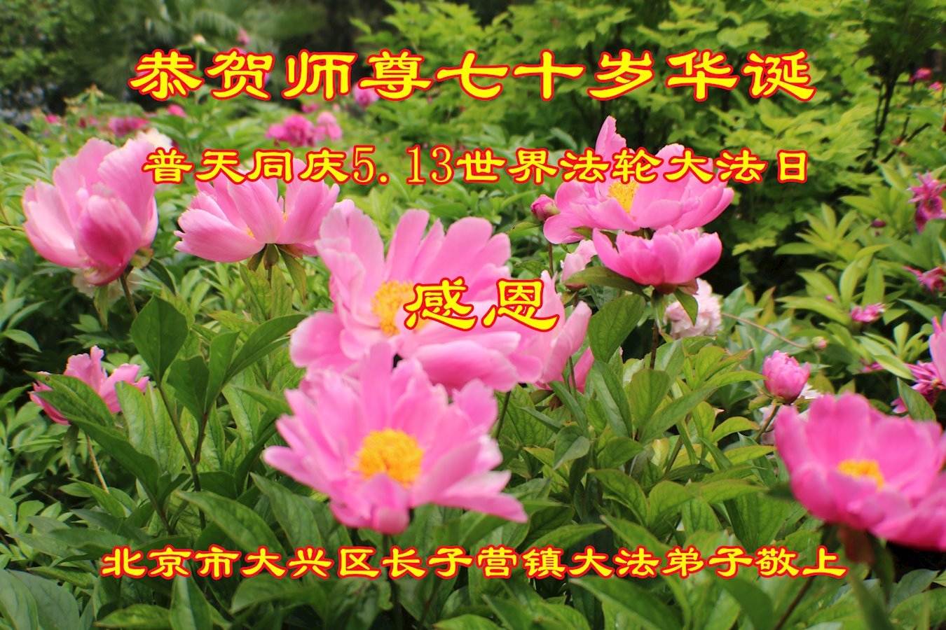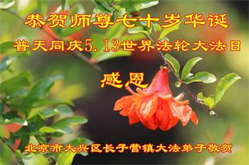 法轮大法好 真善忍好 北京市大兴区长子营镇大法弟子恭祝师尊七十岁华诞暨世界法轮大法日!