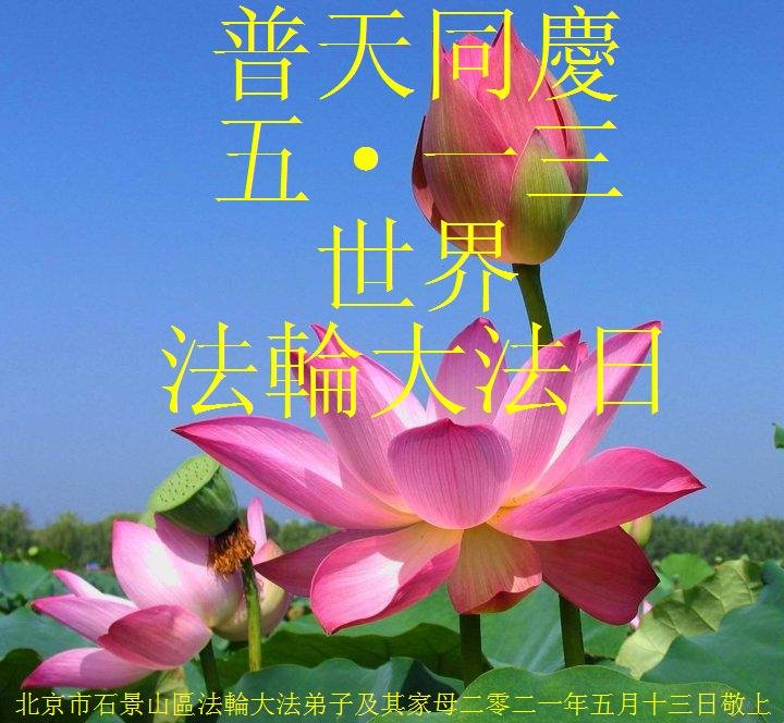【明慧网二零二一年五月十四日】 北京市石景山区法轮大法弟子及家母恭贺二零二一年世界法轮大法日!