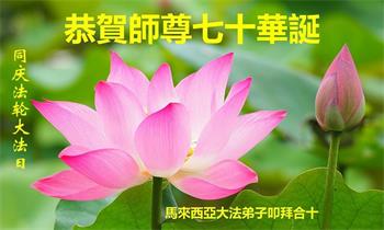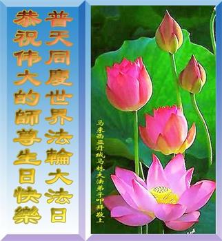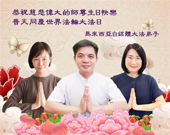 马来西亚大法弟子普天同庆世界法轮大法日!恭祝慈悲伟大的师尊七十华诞暨法轮大法洪传二十九周年!感恩无尽!