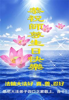 我先生突然失忆,我推荐他拜读《转法轮》,他讲“字字句句灌入心田甘露纯”。他成为法轮大法修炼人后,已经恢复记忆,感恩慈悲伟大的师尊普度,感恩之心无以言表,弟子全家跪拜感恩师尊! 在此,澳洲悉尼四口之家恭祝师父生日快乐! 澳洲悉尼明慧学校学生恭祝师父生日快乐!