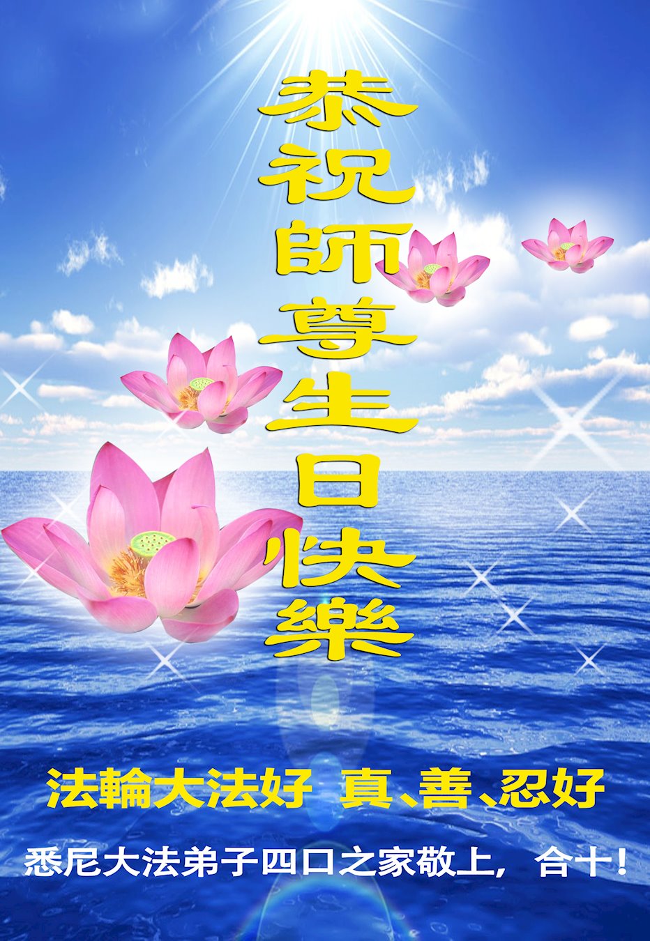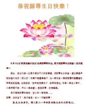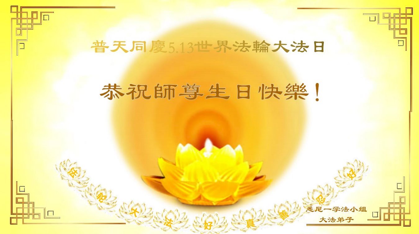 感恩师尊慈悲苦度,弟子唯有勇猛精進,同化大法“真善忍”以报师恩! 澳洲悉尼一大法弟子并代表一大法新学员庆祝世界法轮大法日!恭祝师尊生日快乐!