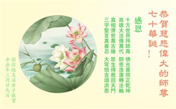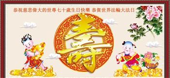 普天同庆世界法轮大法日之际,弟子及家人同修恭祝慈悲伟大的师尊生日快乐!感恩师尊对弟子及家人同修的慈悲保护,弟子们的一切都是师尊给的,在这里叩拜师尊!弟子一定精進实修,叩谢师尊!法轮大法好,真、善、忍好! 海外一大法弟子恭祝师尊七十岁生日快乐!
