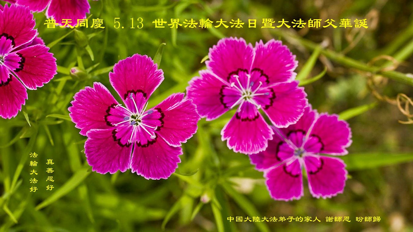 春灿百花芳香迎 普天同庆乐天庭 弟子叩谢创世主 洪恩浩荡度众生 大陆一学法组大法弟子恭祝师尊生日快乐!恭祝世界法轮大法日!
