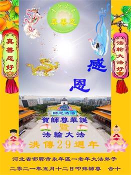 【明慧网二零二一年五月十四日】 河北廊坊市户屯一大法弟子恭贺世界法轮大法日!恭祝师父生日快乐!