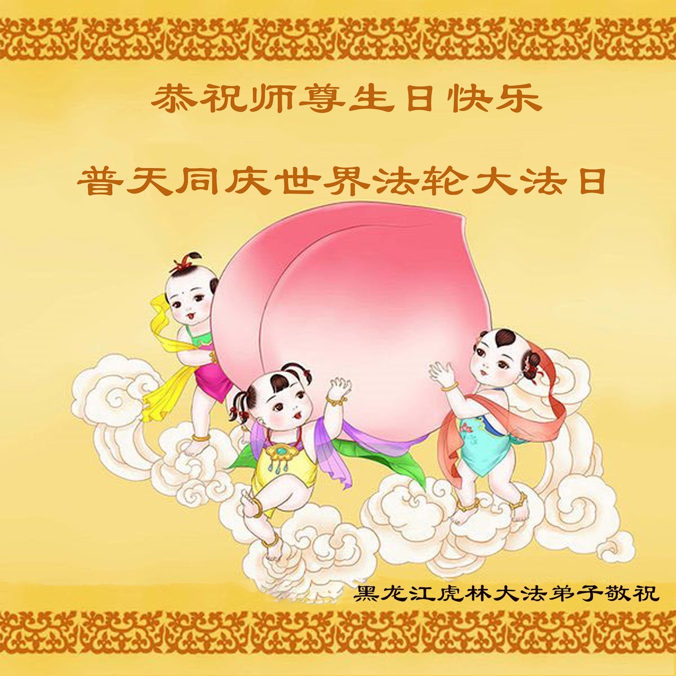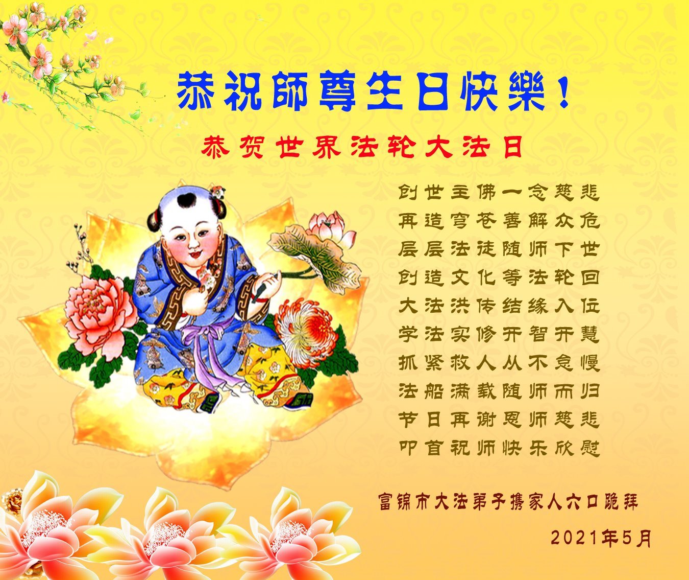 师尊创世一念慈悲 再造穹苍善解众危 层层法徒随师下世 创造文化等法轮回 大法洪传结缘入位 学法实修开智开慧 抓紧救人从不怠慢 法船满载随师而归 节日再谢恩师慈悲 叩首祝师快乐、欣慰! 黑龙江佳木斯市富锦市一大法弟子恭祝师父生日快乐!恭贺5.13世界法轮大法日!