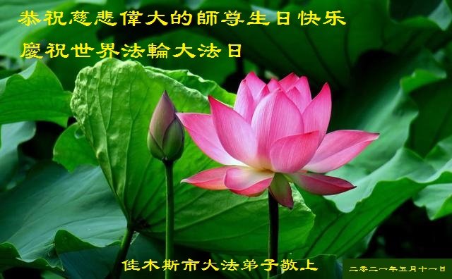 我是一名大法弟子的女儿,在这普天同庆的美好的日子里,我代表我的爸爸、我的丈夫、儿子、恭祝伟大的李洪志师父生日快乐!我们全家人万分感谢李洪志师父的救度之恩,我们相信法轮大法好、真善忍好,支持我妈妈修炼。再一次叩谢大法师父的救度之恩。 佳木斯一大法弟子的家属恭祝李洪志师父生日快乐! 2021年5月10日 东北黑龙江佳木斯一中年大法弟子恭贺师尊华诞暨世界法轮大法日