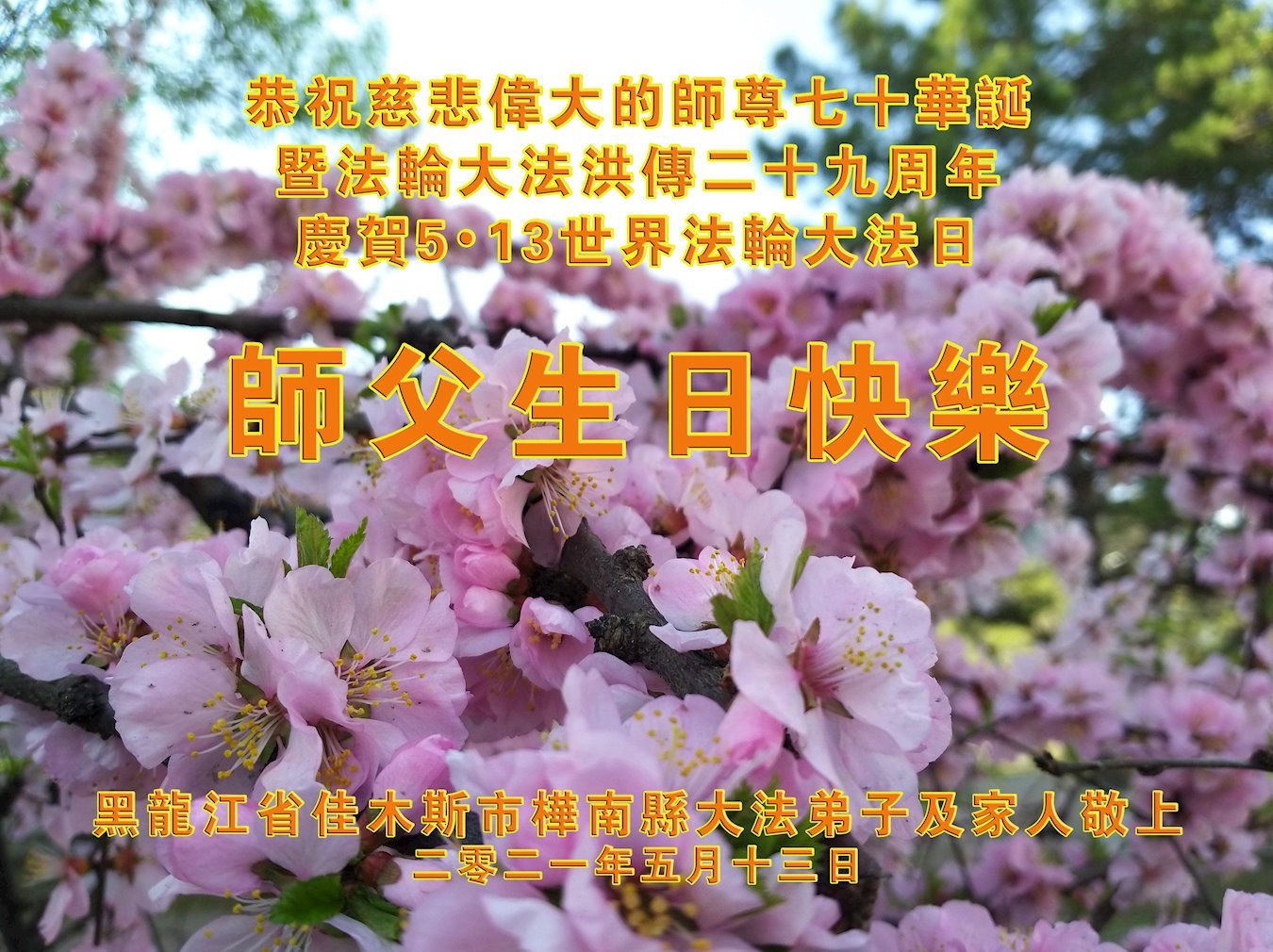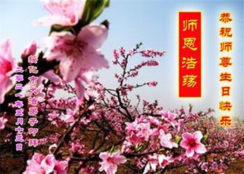恭贺世界法轮大法日! 恭祝师尊华诞! 恭贺世界法轮大法日! 杨柳飘飘吐新芽 杏花桃花满枝挂 普天同庆大法日 天地美景如诗画 救度苍穹师恩重 各界众生齐表达 祝师恩生日快乐! 弟子叩拜普天下 佳木斯大法一粒子叩拜师恩 黑龙江抚远市大法弟子恭祝世界法轮大法日!暨师尊华诞!