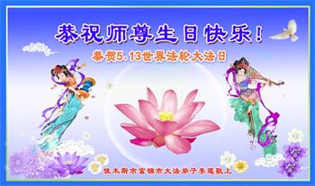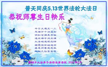 世界法轮大法日就要到了,在这全世界大法弟子欢庆的节日里,在这神圣的时刻,我怀着激动的心情,恭祝师尊生日快乐!在修炼的路上遇到了很多坎坷,我都把自己当作修炼的人,再苦再难,我也不能停下修炼的脚步,我要跟随师尊修炼到正法成功的那一天,请师尊放心! 黑龙江佳木斯市富锦市大法弟子家人恭祝大法师父生日快乐!恭贺世界法轮大法日!