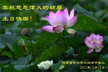 庆祝法轮大法洪传二十九周年! 师父辛苦了!叩拜师尊!恭祝师尊生日快乐! 西安市一学法小组四位大法弟子敬上 二零二一年五月十一日 陕西省西安市城区母女大法弟子恭祝师父生日快乐!