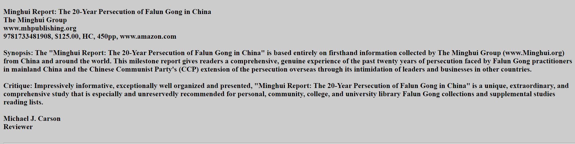《明慧报告:法轮功在中国大陆被迫害二十年》(Minghui Report: The 20-Year Persecution of Falun Gong in China,以下简称《明慧二十年报告》)是由明慧出版中心出版发行,高质量印刷,外观精致。全书共450页,包括26页的彩色照片及图表。 这部里程碑式的报告,全部采用明慧网从中国大陆和世界各地收集的第一手资料信息,让读者全面、切实的体会到在过去的二十年里,中国大陆法轮功学员所面对的迫害,全世界法轮功学员为制止迫害所做的努力,以及中共通过对其它国家领导人和商界的恐吓而延伸到海外的迫害。书中对这场现代正邪大战的记述,不仅清晰的揭露了迫害在海内外的严酷,也揭露了发动和推动这场迫害的元凶,及中共“610”等机构在其中扮演的角色。 这本书还澄清了许多中共谎言对中国问题专家和学者的误导。其中,法轮功基本真相三则、全球法轮功学员反迫害历程、迫害数据统计图表,以及“关于法轮功”的基本内容,既方便尚未系统了解过法轮功的读者翻阅,也适合于想深入了解法轮功真相的主流人士,包括律师、关注人权者、商界精英、学者和政治家等。 美国资深书评推荐:独特、非凡和全面的研究  图4:美国中西部书评的评论员迈克尔·卡森(Michael J. Carson)二零二零年四月推荐《明慧二十年报告》 |