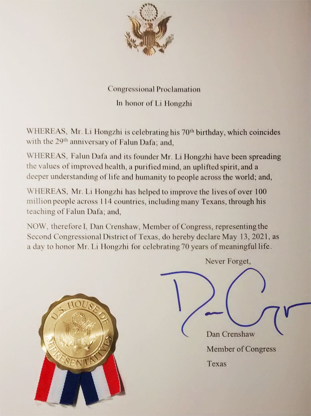 图2:国会议员丹·克伦肖(Dan Crenshaw)颁发的褒奖 |