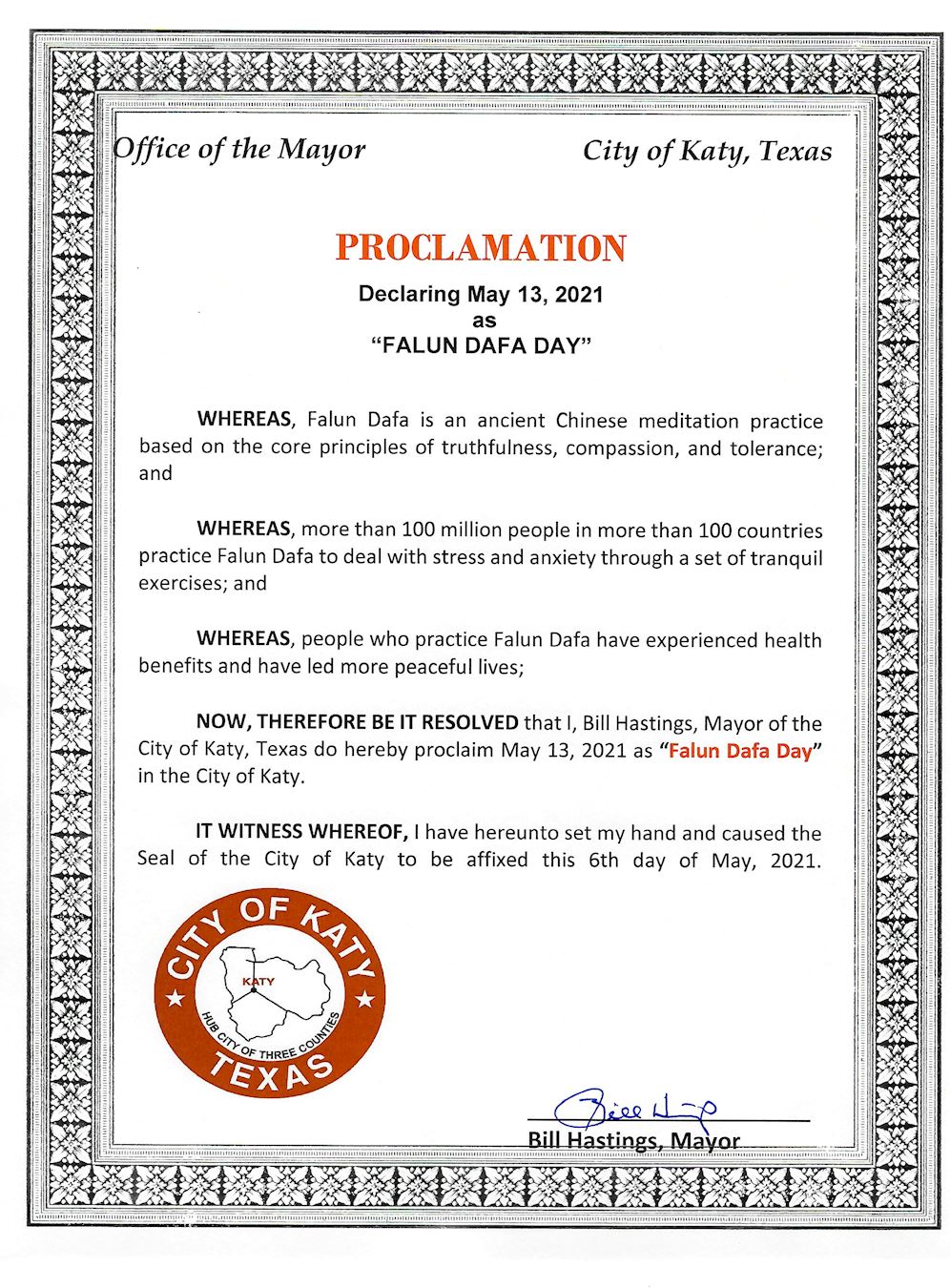 国会议员丹·克伦肖(Dan Crenshaw)颁发的褒奖译文如下: 向李洪志致敬 鉴于,李洪志大师正在庆祝自己的七十华诞(生日),恰逢法轮大法(弘传)二十九周年;并且, 鉴于,法轮大法及其创始人李洪志大师一直在全世界传播的价值是改善健康,净化心灵,振奋人心以及对生活和人类的更深刻理解; 鉴于,通过李洪志大师传授法轮大法,他帮助改善了100多个国家的上亿人的生活,包括许多德州人在内; 因此,我,国会议员丹·克伦肖(Dan Crenshaw)代表德克萨斯州第二选区,特此声明 二零二一年五月十三日,为: “祝贺李洪志大师庆祝七十年有意义的人生的一天” 。 永不忘记, 丹·克伦肖(Dan Crenshaw)签名 国会议员(Member of Congress) 德克萨斯州 (Texas)  图3:德克萨斯州凯蒂市长宣布“法轮大法日” |
