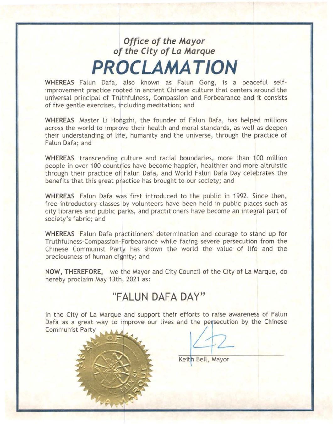 美国德克萨斯州拉玛克市颁发的褒奖译文如下: 鉴于,法轮大法,又称为法轮功,起源于古老的中华文化,是以真、善、忍宇宙法理为中心的 一种平和的、自我提升的功法,包括打坐在内的五套柔和的功法。 鉴于,李洪志大师,法轮大法的创始人,已经在世界各地帮助上亿的修炼者改善了健康和提升道德,以及使他们通过修炼法轮大法而提高了对生命、人生以及宇宙的认识。 鉴于,法轮大法超越文化和种族的界限,已弘传至一百多个国家和地区的上亿修炼者,通过修炼法轮功之后,(他们)更快乐、健康、更关心他人。在世界法轮大法日庆祝这极好的修炼,给我们社会带来好处。 鉴于,法轮大法于一九九二年首次在中国传播,自此以后,志愿者在公共场所举办许多法轮大法免费学习班,如:在市图书馆和公园。(法轮大法)修炼者已经成为社会结构的一个组成部份。 鉴于, 法轮大法修炼者以决心和勇气坚守真善忍。 面对中共的残酷迫害,对世人展现出生命的价值和人性的尊严。 现在, 因此,我们市长和拉玛克市议会特此宣布二零二一年五月十三日为: “法轮大法日”。 拉马克市(La Marque)支持他们(法轮大法修炼者)的努力,以提高人们对法轮大法的认识,这是改善我们的生活、以及减少中共迫害的一种最佳途径。 市长基思·贝尔(Keith Bell) 签名