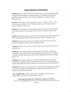 褒奖译文如下: 褒奖令法轮大法日 鉴于,法轮大法(又称法轮功)是上乘性命双修功法,包括动功、打坐和基于真、善、忍宇宙特性的教导;并且 鉴于,法轮大法于一九九二年由李洪志先生公开传出,现已传播至百余国家,上亿人修炼,广受赞誉;并且 鉴于,法轮大法超越文化和种族的界限,为建立一个祥和、忍让且更加包容慈善的社会所做出的贡献;并且 鉴于,越来越多的美国人在法轮大法的修炼中,得到了身心的净化,并将贤德及祥和的氛围带给社区;并且 鉴于,纽约州橙县的法轮大法修炼者证实修炼法轮大法能减轻压力、增进健康、提高精神境界;并且 鉴于,无数的法轮大法修炼者因他们的信仰在中国遭受迫害;并且 鉴于,法轮大法修炼者面对中共的残酷打压,为维护真、善、忍的道德准则所展现出的勇气和坚定信念使世界人民看到了生命和人类尊严的可贵;并且 鉴于,二零一零年三月十六日美国国会众议院通过了第六零五号决议案。此决议案敦促中共当局停止对法轮大法的迫害运动,并对那些遭受迫害、甚至被迫害致死的法轮功学员及他们的家人表示同情;并且 鉴于,今年五月十三日标志着第二十二届“世界法轮大法日”,暨法轮大法由李洪志先生公开传出的第二十九整年; 鉴此,我,纽约州Warwick镇镇长Michael P. Sweeton, 特此宣告二零二一年五月十三日为纽约州Warwick镇法轮大法日,颂扬真、善、忍,并相邀所有市民届时关注此盛事, 庆贺法轮大法给全世界上亿人民通过实践真、善、忍宇宙特性所带来的健康和福份。 纽约州Warwick镇镇长 Michael P. Sweeton 纽约州橙县汉普顿堡镇(Hamptonburgh)镇长罗伯特·扬科夫斯基(Robert S. Jankowski)宣告二零二一年五月十三日为纽约州普顿堡镇法轮大法日,并相邀所有市民届时关注此盛事,庆贺法轮大法给全世界上亿人民通过实践真、善、忍宇宙特性所带来的健康和福份。  |  | | 图14~15:纽约州橙县汉普顿堡镇(Hamptonburgh)镇长罗伯特·扬科夫斯基(Robert S. Jankowski)褒奖法轮大法日 |