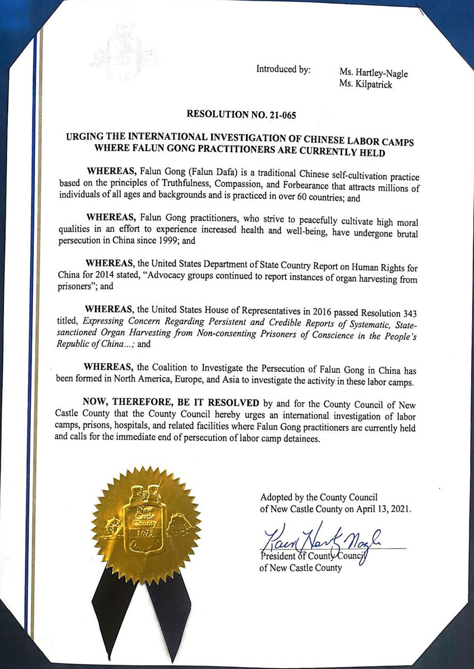 以下是新堡县(New Castle County)决议案的译文: 特拉华州新堡县议会21-065号决议 敦促对中国关押法轮功学员的劳教所进行国际调查 鉴于,法轮功(法轮大法)是基于真、善、忍原则的中国传统的自我修炼,吸引了60多个国家和地区的、数以百万计的不同年龄和背景的人; 鉴于,法轮功修炼者致力于和平地培养高尚的道德品质,以期增进健康和福祉,自1999年以来在中国遭受了残酷的迫害; 鉴于,美国国务院2014年关于人权的国家报告中国部份指出:“支持团体持续报告从囚犯身上摘取器官的情况”; 鉴于,美国众议院在2016年通过的第343号决议,题为《关于中国从未经同意的良心犯身上进行系统的、经国家批准的摘取器官的,持久性和可信性报告的关注》; 鉴于,已经在北美、欧洲和亚洲成立了调查中国对法轮功迫害的联盟,以调查在这些劳改营中的活动。 值此,已决议,新堡县议会特此敦促对中国目前关押法轮功学员的劳教所、监狱、医院及相关设施进行国际调查。并呼吁立即停止对劳教所被拘留者的迫害。 新堡县议会通过 郡议会主席凯伦·哈特利-纳格(Karen Hartley-Nagle)签名
