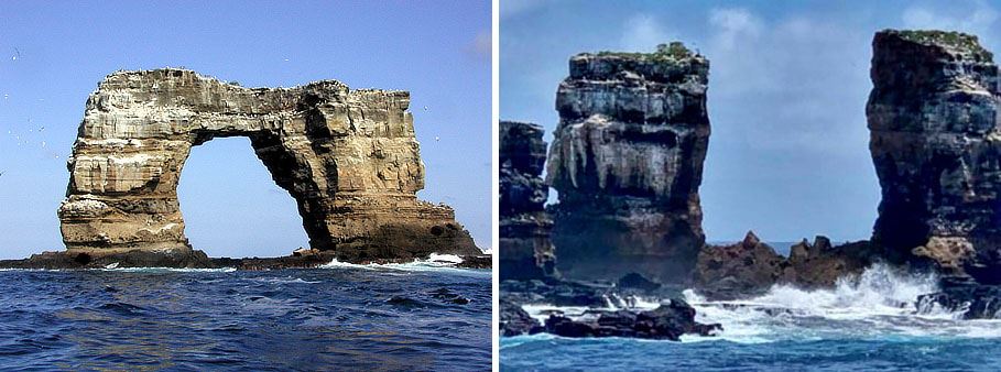 【明慧网二零二一年五月二十二日】(明慧记者玉紫菱报道)二零二一年五月十七日,南美洲国家厄瓜多尔环境部通过社交媒体脸书(Facebook)公布,加拉帕戈斯群岛(Galapagos Archipelago)地标“达尔文拱门”崩塌。照片显示,原本弯曲的拱状岩石已经倒塌落入海中,仅剩下两根柱子。 图:二零二一年五月十七日,厄瓜多尔环境部公布:“达尔文拱门”崩塌。 左图是坍塌前的拱门。右图显示,该拱门仅剩下两根柱子。 |
