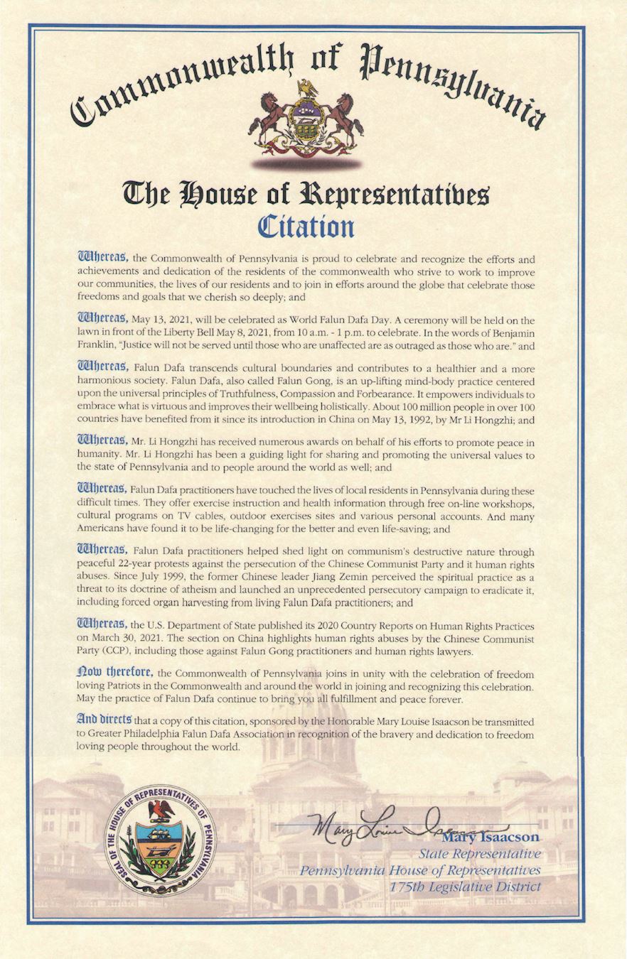 褒奖状译文: 宾夕法尼亚州众议院 鉴于,宾夕法尼亚州为庆祝和认可宾州居民的努力、成就和奉献精神而感到自豪,他们致力于改善我们的社区、居民的生活,并且和全球一起庆祝我们非常珍惜的自由和希望; 鉴于,2021年5月13日将庆祝世界法轮大法日。 2021年5月8日上午10点至下午1点将在自由钟前的草坪上举行庆祝仪式。用本杰明·富兰克林的话说,“只有当那些旁观者和受害者一样愤慨时,正义才能得以伸张。” 鉴于,法轮大法超越了文化界限,为建立一个更健康、更和谐的社会做出了贡献。法轮大法,又称法轮功,是以“真、善、忍”为准则的自我提升的身心修炼,能使人道德回升,身体健康。自从李洪志先生于1992年5月13日在中国传出法轮大法之后,已在100多个国家有大约1亿人受益。 鉴于,李洪志先生为促进人类和平所做的努力获得了无数奖项。李洪志先生一直是指导宾州及全世界人民普世价值观的指路明灯。 鉴于,在这困难时期,法轮大法修炼者帮助了宾州当地居民的生活。他们通过免费的在线研讨会、电视文化节目、户外炼功以及各种个人方式提供炼功和健康信息。许多美国人发现法轮大法正在使人们的生活变得更美好,甚至挽救生命。 鉴于,法轮功学员通过22年的和平请愿,以抗议中共的迫害及其对人权的侵犯。自1999年7月以来,前中共头目江泽民将这种信仰视为对其无神论的威胁,并发起了一场空前的运动迫害法轮功,包括从活着的法轮功学员身上强行摘取器官; 鉴于,美国国务院于2021年3月30日发布了2020年美国人权报告。中国的部份着重强调了中国共产党(CCP)对人权的侵犯,包括侵犯法轮功学员和人权律师的人权的行为。 鉴此,现在宾夕法尼亚州和全世界热爱自由的人们一起,庆祝和表彰世界法轮大法日庆祝活动。愿法轮大法继续带给您永远的充实与和平。 并指示,将这份由玛丽·路易斯·艾萨克森(Mary Louise Isaacson)议员发起的褒奖副本转交给大费城法轮大法学会,以表彰其勇气及对全世界人民热爱自由的奉献。 宾州第175区众议员玛丽·艾萨克森(Mary Isaacson)签字