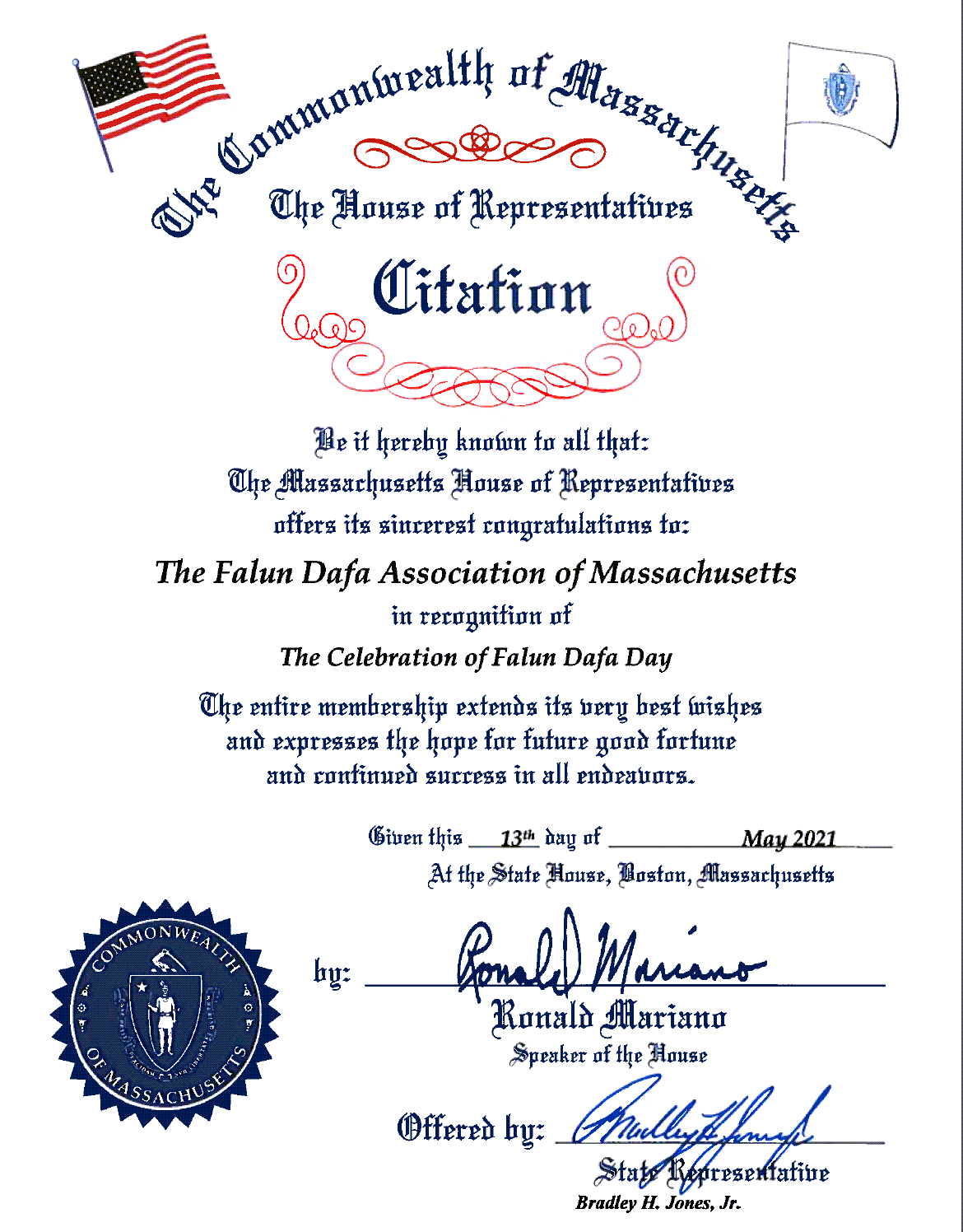 谨在此公布:麻萨诸塞州众议院向新英格兰法轮大法学会致以法轮大法日的真诚祝贺。全体议员向 你们传达最佳祝福,希望诸事好运,持续成功。 麻州众议院议长 罗纳德·马里亚诺(Ronald Mariano) 发起人 麻州众议院少数党领袖及众议员 布拉德利·琼斯(Bradley H. Jones, Jr.)