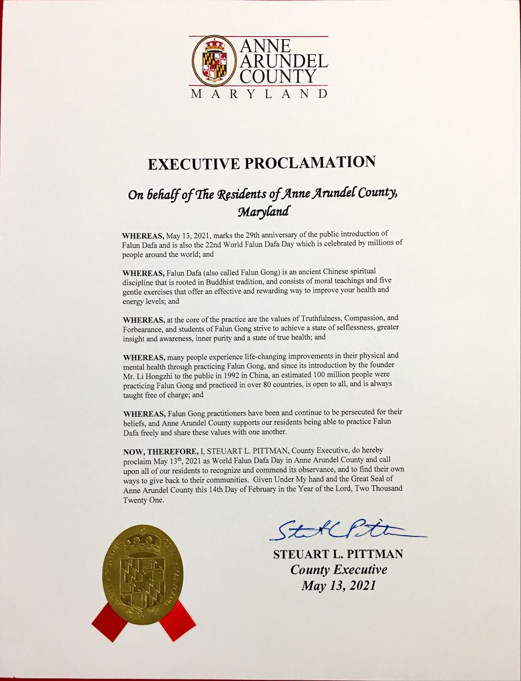 | 【明慧网二零二一年五月七日】第二十二届“世界法轮大法日”来临之际,美国马里兰州安阿伦德尔郡(Anne Arundel County)颁发褒奖。褒奖中说:“郡长斯图尔特·皮特曼(Steuart L. Pittman),宣布五月十三日为安阿伦德尔郡‘世界法轮大法日’。” 褒奖中还说:“许多人修炼法轮功后,身心受益,人生从此改变”,“法轮功弘传全世界八十多个国家(编注:一百多个国家和地区),估计有一亿人修炼。”“安阿伦德尔郡支持居民能够自由地修炼法轮大法,并分享这些价值。”  图:美国马里兰州安阿伦德尔郡(Anne Arundel County)颁发褒奖,宣布五月十三日为安阿伦德尔郡“世界法轮大法日”。 |