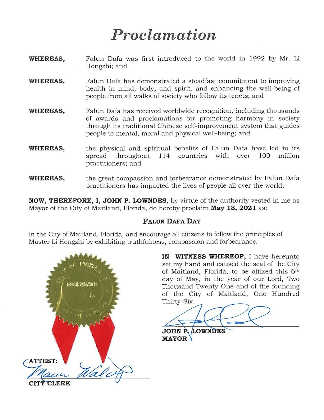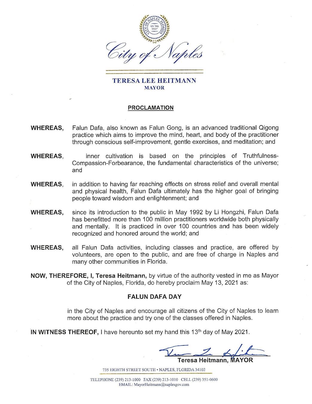 | 【明慧网二零二一年五月八日】在法轮大法弘传世界29周年来临之际,世界各地政要纷纷褒奖法轮大法。美国佛罗里达州梅特兰市(Maitland),那不勒斯市(Naples)和托纳海滩市(Daytona Beach)致信法轮大法学会,褒奖法轮大法,宣布二零二一年五月十三日为该市的法轮大法日,并鼓励所有市民遵循李洪志大师的教导,实践真善忍。 除了上述三个城市,佛罗里达州劳德代尔堡市(Fort Lauderdale)市长代表市政委员会宣布二零二一年五月十三日为该市“感恩法轮大法日”,以及南代托纳市(South Daytona)和韦斯顿市(Weston)市长日前也分别宣布五月十三日为他们城市的法轮大法日。 梅特兰市(City of Maitland)的市长约翰·朗兹(John P Lowndes)宣布2021年5月13日为梅特兰市法轮大法日,并鼓励所有市民遵循李洪志大师所教导的真、善、忍原则。 梅特兰市(Maitland)市褒奖令译文: 鉴于,法轮大法1992年由李洪志先生首次向世界弘传; 鉴于,法轮大法坚定地致力于改善人们的身心健康,并使得遵循其原则的社会各界修炼者从中受益; 鉴于,法轮大法已获得全世界的表彰,其中包括成千上万的奖项和褒奖,因为他通过中国传统的自我提高促进社会和睦,并引导修炼者得到精神,道德和身体的福祉; 鉴于,法轮大法对人身心上的好处使得1亿人修炼,并在一百多个国家和地区广泛传播; 鉴于,法轮大法修炼者展现出的大善、大忍之心已经影响到了世界各地人们的生活; 因此,现在,我,约翰·朗兹(John P Lowndes) 作为梅特兰市(City of Maitland)的市长,特此宣布2021年5月13日为梅特兰市: 法轮大法日并鼓励所有市民遵循李洪志大师的教导,实践真、善、忍原则。 市长 约翰·朗兹 2021年5月6日 那不勒斯市(Naples)市长特蕾莎·海特曼(Teresa Heitmann)致信法轮大法学会,宣布2021年5月13日为那不勒斯市法轮大法日,并鼓励那不勒斯全体居民了解法轮功、并学炼法轮功。 褒奖令译文如下: 鉴于,法轮大法又称法轮功,是一种上乘的传统气功修炼,目的是通过缓慢的动作和打坐,修炼者有意识地自我提高身心健康; 鉴于,法轮大法的内在修炼是基于宇宙的根本特性真、善、忍的原则; 鉴于,除了对缓解压力和身心健康会产生深远的影响外,法轮大法最终会带给人们开智开慧的更高目标; 鉴于,自从1992年由其创始人李洪志先生把法轮大法介绍给公众以来,法轮大法已经使一亿多人身心受益。法轮大法已在一百多个国家得到广泛弘传和赞誉; 鉴于,所有法轮大法的活动,包括课程和炼功都是由志愿者提供的,在那不勒斯和佛罗里达的许多其他社区免费向公众开放; 因此,现在,我,佛罗里达州那不勒斯市市长特蕾莎·海特曼凭借那不勒斯市的居民赋予我的权利,特此宣布2021年5月13日为法轮大法日 并鼓励那不勒斯市的所有居民多了解法轮功,并试一试在那不勒斯提供的法轮功课程。 市长:特蕾莎·海特曼 代托纳海滩市褒奖令: 代托纳海滩市(Daytona Beach)市长德里克·亨利(Derrick L Henry)宣布5月13日为代托纳海滩市“法轮大法日”。赞颂法轮大法修炼者所表现出的大善大忍之心已经感动了世界各地善良的民众,并表彰李洪志大师和真善忍精神。 褒奖译文如下: 表彰法轮大法鉴于,法轮大法于1992年由李洪志先生首次向世界传出。他坚定地致力于改善人们的身心健康,并给遵循其原则的社会各界修炼者带来福祉; 鉴于,法轮大法得到了世界上广泛的认可,其中包括成千上万的奖项和褒奖,因为它通过中华传统的自我提高以促进社会和睦、并引导修炼者得到精神、道德和身体的福祉; 鉴于,法轮大法对人身心上的益处使之能够在一百多个国家广泛传播,使得1亿人修炼;法轮大法修炼者所表现出的大善大忍之心已经感动了世界各地善良人的心; 鉴于,多年来,代托纳海滩的城市岛屿一直是学习法轮大法的地方。通过打坐,炼功者有望获得更好的健康,并最终实现精神上的启迪。 因此,现在,我,德里克·亨利,佛罗里达州代托纳海滩市市长代表市议会,宣布2021年5月13日为代托纳海滩市 法轮大法日市长 德里克·亨利 2021年5月5日