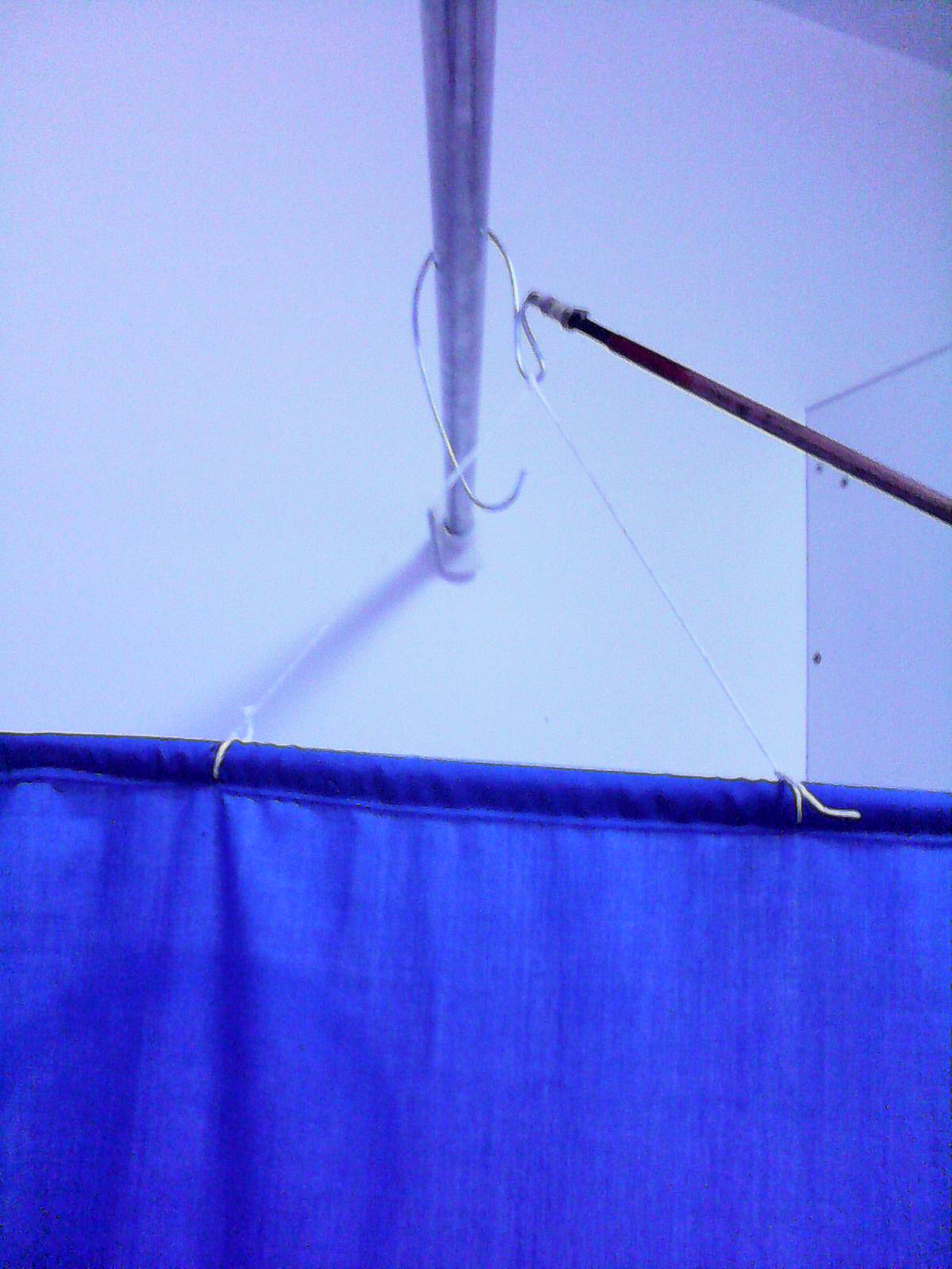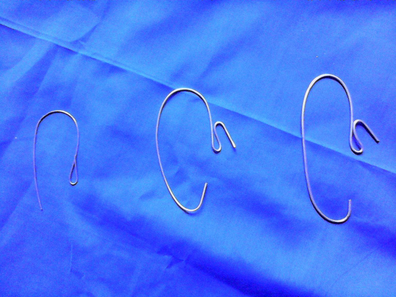第一种:用于挂A4纸的四分之一或一半大小的树挂(见图一,左一) 树挂采用的是明慧网上的真相粘贴,做成正反面都有真相内容的双面树挂,然后压膜、顶部打孔穿绳,绳子打结后和钩子拴一起,一个小树挂就做好了。出门前可根据情况多准备一些,码齐了放包里。这样的树挂轻便,而且样式精美。疫情期间,同修将A4纸的四分之一大小的树挂挂在常人家的门把上,都被当作护身符拿家去了。A4一半大小的树挂一般挂在伸手就能够到的地方,方便常人拿取。 钩子的制作:用细铁丝,一端做成直钩,另一端围个弯朝上,把树挂的绳打个结拴上,就做好了。 使用:因为方便明真相的常人拿回家,所以不用鱼竿,用手挂在伸手就能够到的高处后,将钩子直的、长的那端轻轻一弯,挂上就可以了。 第二种:用于挂竖版大长条幅的钩子(见图一,左三) 这样的条幅下端一般坠有石头等重物,所以采用的铁丝最粗也最大,另外与第一种有两处不同,第一种的一端是直的长的,这种的那一端也长一些,但要朝上往里弯,形成个圈,但不能封口,因为树枝要从这个口进入,之所以往里弯,是风大时条幅被刮的摇来摇去,如果像第一种钩子就容易被摇掉,这个带个回弯儿,开口变小,不容易摇掉,同时可能再被回弯挂住,增加条幅在户外悬挂时间,减少被风吹掉的几率(见图二)。 制作:用粗铁丝,一端围个弯朝上,另一端围一个S形的弯用于拴绳和往鱼竿顶部的孔里放,出门前,绳子打结,拴在钩子上,就做好了。 图二 模拟用鱼竿往挂条幅,左图模拟用鱼竿往树上挂的情景,右图为风大吹动条幅大幅度摆动后钩子可能被吹倒过来,被回弯挂住第三种:用于挂A4大小的树挂(见图一,左二) 树挂的打印、压膜与第一种相同,只是尺寸是A4大小的;因为也用鱼竿往高处挂,所以钩子的制作样式和第二种挂大条幅的钩子相同,只是用不着太粗的铁丝,铁丝的粗细介于第一种和第二种之间,稍硬实一些,适合在户外长期悬挂就可以了。  图三:不同钩子对应不同用途 |