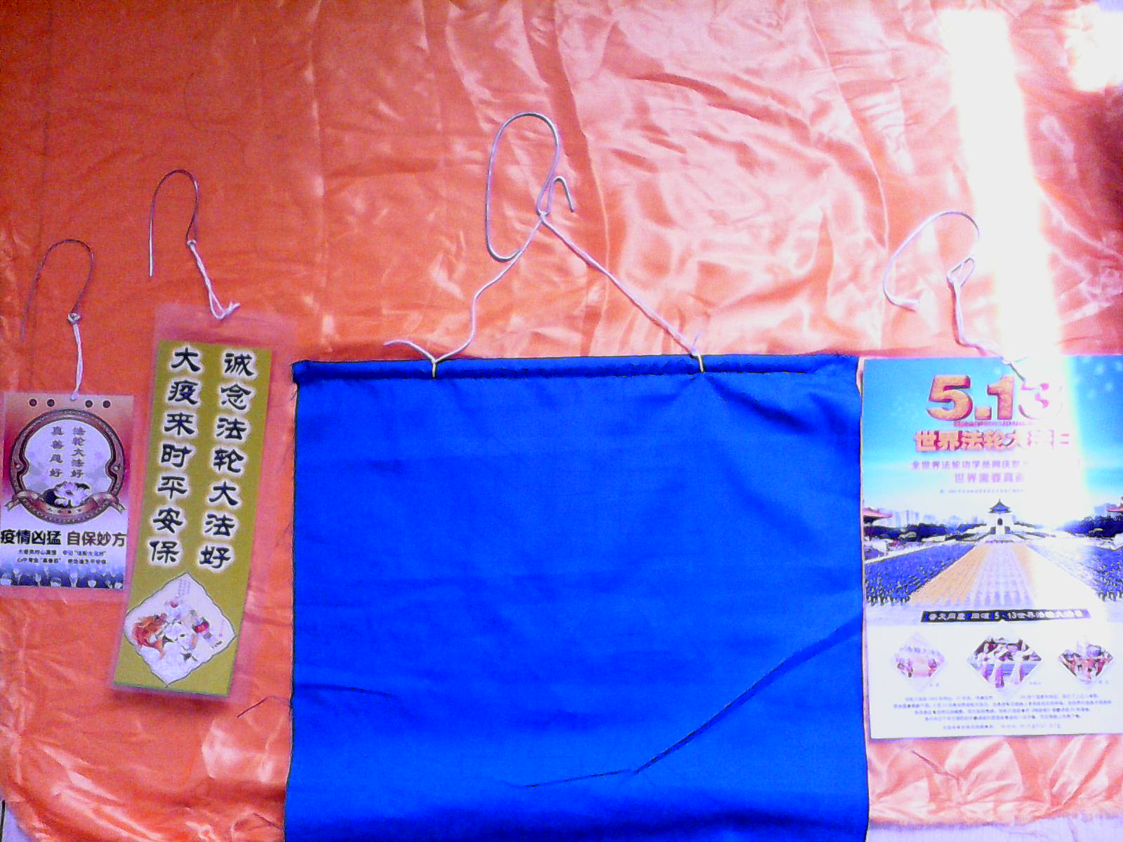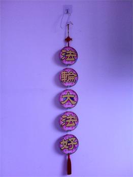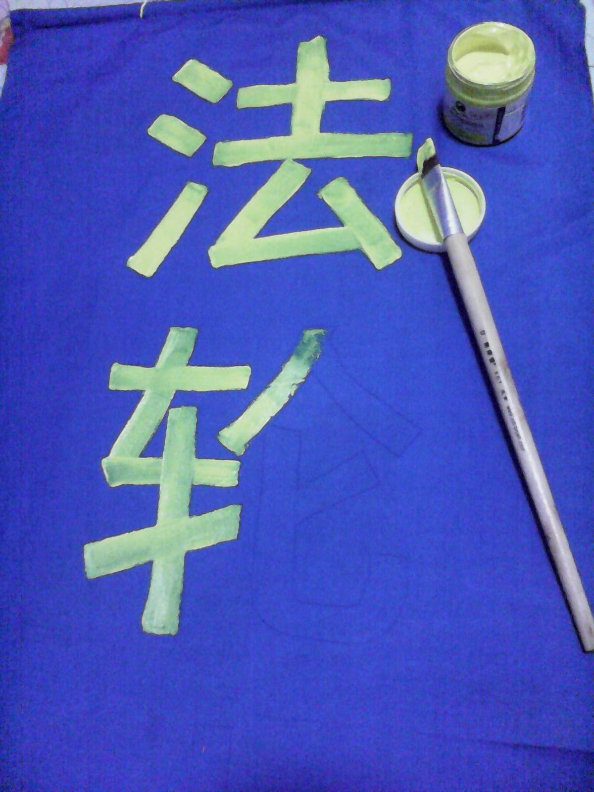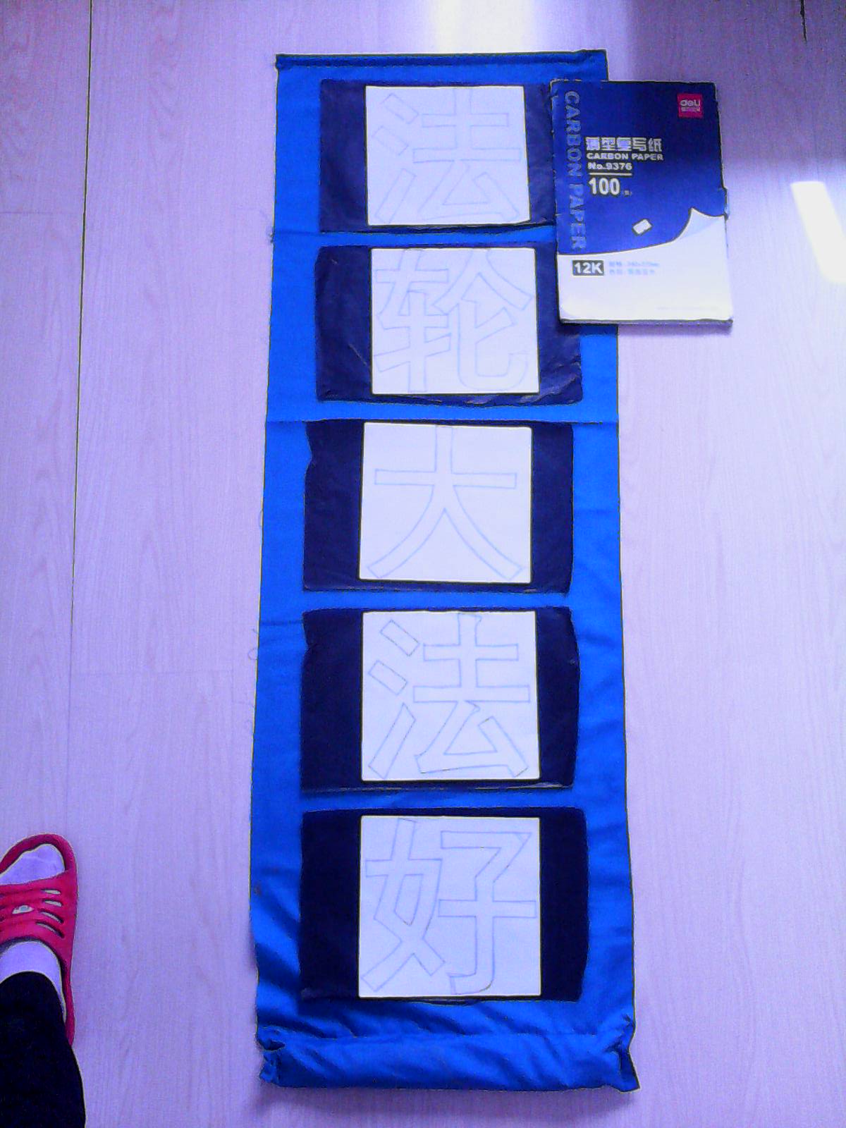 可以上网买一个家用小型的缝纫机,操作也很方便,价钱也不贵。手缝当然也行,大法的东西要做得像样。 3.写大字 可以买POP唛克笔直接往红布或黄布上书写,蓝色的布不太清楚,用前可在不明显处试一试。笔者用的是丙烯画颜料,淡黄色、中黄色都行,文化用品商店可以买到。因为怕直接写写不端正,于是请资料点同修用A4或A3纸打出“法轮大法好”或“真善忍好”的大字,然后在条幅上铺好复写纸,调整好字与字之间的距离,用笔将打好字的沿着轮廓描下来通过复写纸印到条幅上,然后再用平头的粗毛笔蘸丙烯颜料将字的内部填充满,多写几遍,让颜色深一些,晾干条幅。 4.在条幅顶端各靠左、右四分之一处用钩针将粗线固定,系好。然后取中将绳子和钩子拴在一起。这样条幅就制作好了。 当然,可以先写大字,过后再进行其他步骤。 不足之处,请同修慈悲指正。下面为实际效果照片。