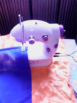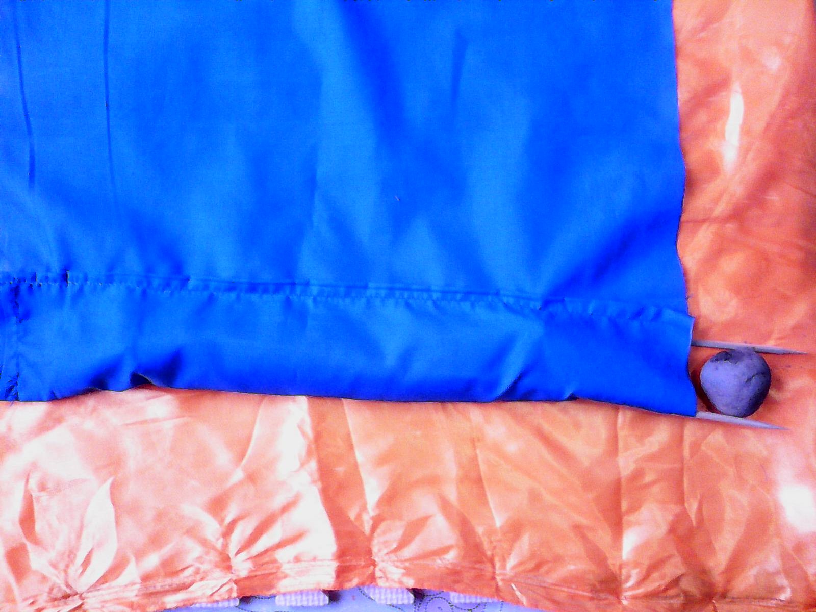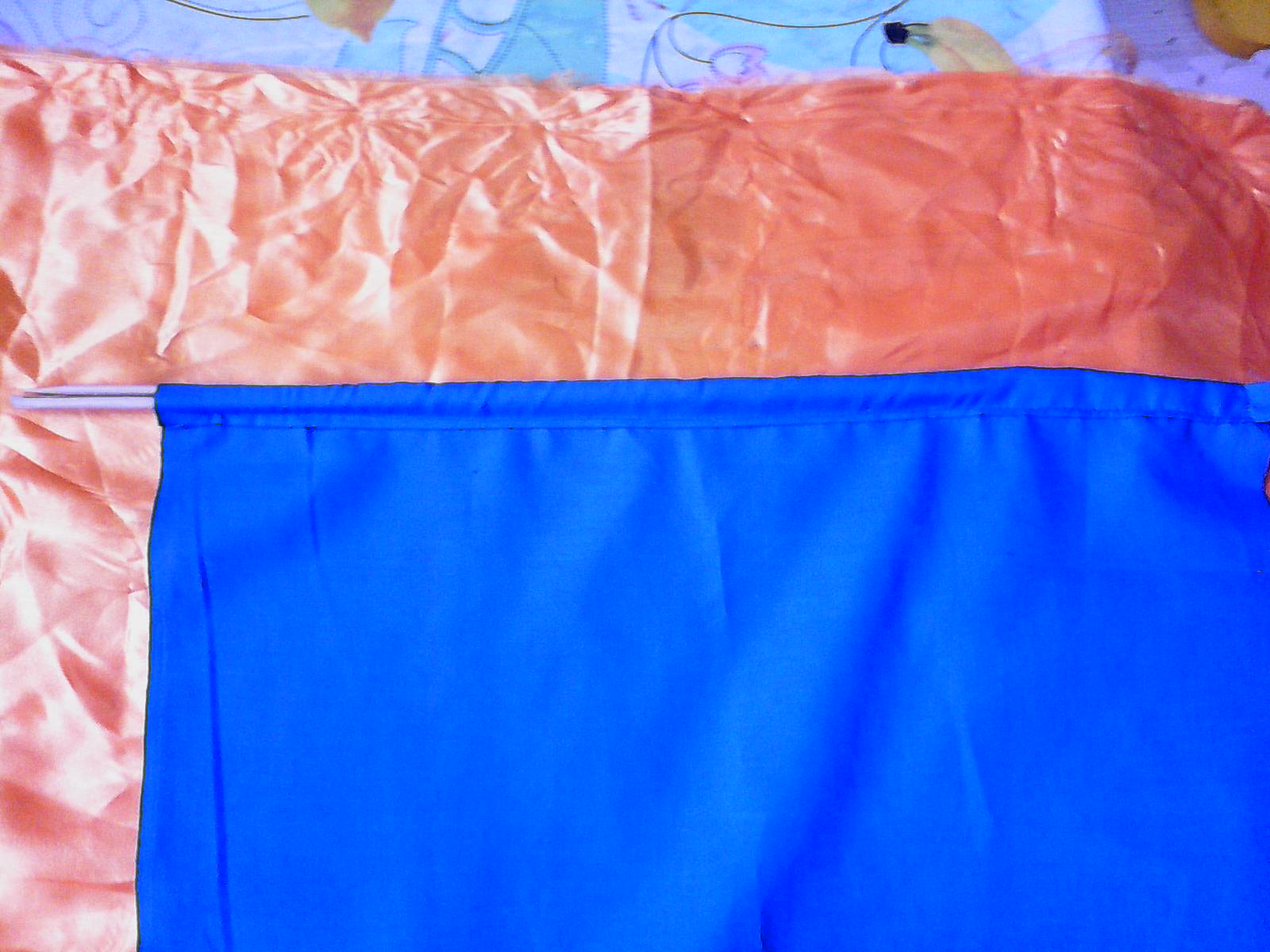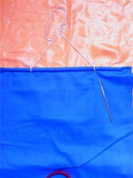 二、一米五长竖版大条幅的制作 1.条幅多是红底黄字、黄底红字或蓝底黄字,下面就我选用的蓝底黄字的举例。恰巧买到的布是宽幅为90公分的,从中间一分为二。条幅的宽即为45公分,长度为1米5,这样条幅最终做好后长度大概为1米3左右,因为是竖版条幅,涉及到悬挂高度和防止常人轻易取下的问题,所以条幅最终成品的长度不建议太长,最好不超过1米5。 2.条幅顶部和底部的码边 条幅的顶部码一个约2公分的边,里边放几根竹签(可以在日杂商店买到,就是常人用来烤肉串的那种)。然后把两端封口,为的是不让竹签掉出来。经实践证明,三、四根竹签就可以支撑整个条幅的重量,而且不塌腰。  图四:将三、四根竹签放進码好的条幅顶部 |