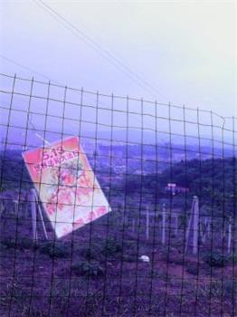 条幅的底部码一个大约5公分的边,捡一些小石头放里面,注意不要太多太重,要考虑钩子铁丝和伸长后鱼竿顶部的承重能力,再放两根竹签進去,将底部撑起来,让条幅平整,最后封口。  图五:将石头和竹签放入条幅的底部 |