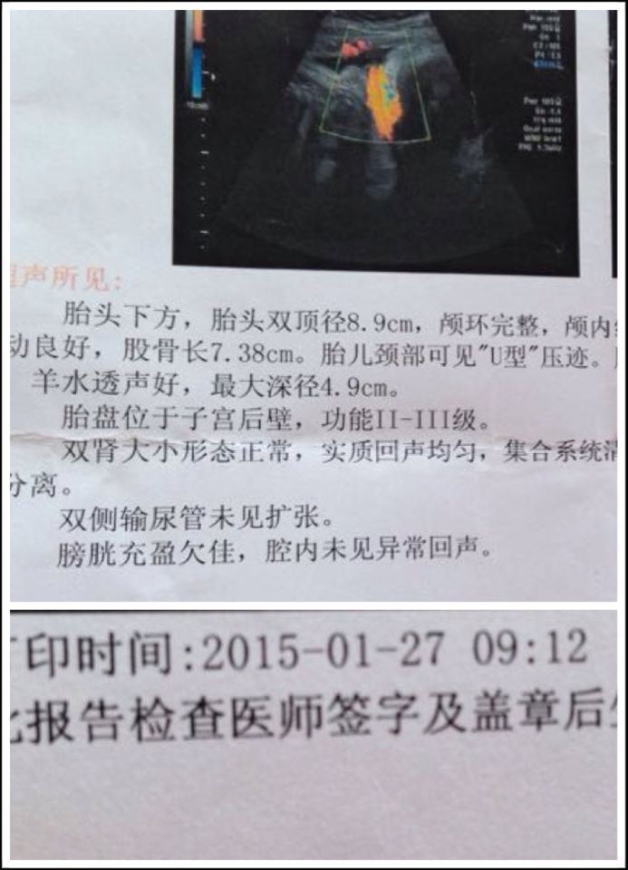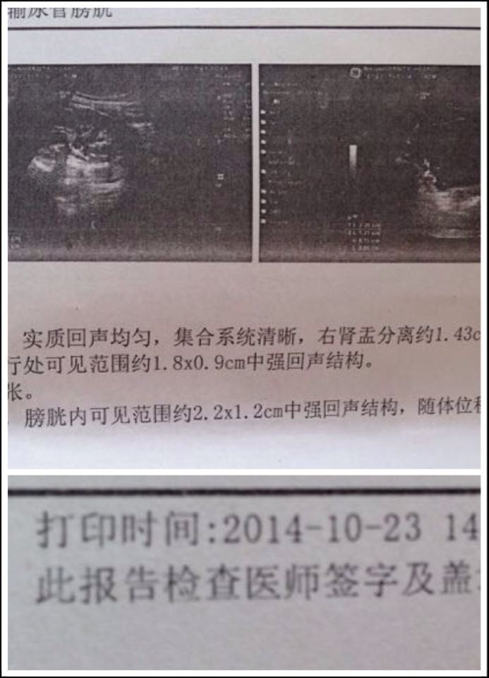 | 【明慧网二零二一年六月十八日】法轮大法神奇殊胜,法力遍布洪微。本文所讲的事例,仅仅是大法威力在世俗层面的一个小小体现。大法能给人类带来世间的福祉,而大法的神奇和殊胜更是为了让人返本归真。* * * * * * * 我的先生是一位法轮大法的修炼者。作为大法修炼者的家人,我想分享下面的个人经历,希望能让人了解法轮大法的神奇。 二零一四年五月,我怀孕,之后,就停职在家。开始,一直都很正常,在怀孕六个半月,也就是十月二十三日凌晨一点左右,肚子开始疼,又吐又拉,家人让我立即去医院。我以为是着凉,就忍到了第二天早上。 早上七点,肚子还是很疼,吃了点儿粥,都吐出去了。 到医院后,医生听说,是肚子疼,初步认为是早产。做了内诊,结果没有问题,可当时疼得已经走不了路。 医生怀疑是阑尾炎。这是一家专科妇产医院,所以家人送我去另一家综合医院,挂了外科,看看是不是阑尾炎。检查结果出来后,医生说不是阑尾炎。没办法,只好又挂妇产科,并住院继续检查,最后诊断为肾结石,详情见B超图(下图一)。 因为我已经怀孕六个月了,没有办法用药。专科主任说,治疗的办法是碎石和插管,而这两种治疗方法都对胎儿有危险。我不想伤害到孩子,选择不接受治疗,只能忍。 住院后的第二天清早,在腹痛有所缓解的情况下,我先生陪我在医院走廊慢走。我的主治医生来看我,询问我现在感觉怎么样。随后又说,你只能听天由命了。 我的先生那时刚刚开始修炼法轮功,跟我讲了法轮大法的美好和被中共诬陷、被迫害的真相。平时我先生常叮嘱我,在关键的时候,要心中有佛,诚心默念九字真言。 住院的第二天晚上,我又腹痛难忍。在这无助的情况下,我心里祈求大法师父的护佑,并默念“法轮大法好,真善忍好”,念着念着,我就睡着了。 我做了一个非常清楚的梦,梦见一个大莲花上面,有一个个亮晶晶的颗粒状的东西。有一只大手,从里面一颗一颗的摘掉那些颗粒状的东西! 早晨起来,我排了有二百毫升的血尿。从那以后,腹痛基本好了。在医院观察了几天,我就出院了。 回家后,还会偶尔腹痛,痛的时候,我就诚心默念九字真言,渐渐的疼痛减轻,后来就不痛了。 怀孕九个月时,回泌尿科复查,B超显示;肾脏回声正常,那两颗结石都不见了!(详情见下图二)。面对这样的奇迹,我坚信了先生讲过的,明真相,得福报。 二月八日晚,我的宝宝出生了。之前,B超显示脐带绕颈一周,医生说,没有大问题,可以顺产。 分娩时,出现了胎儿缺氧,接产医生很紧张,立即给我吸氧。我和先生都在心里默念“法轮大法好,真、善、忍好”,求大法师父护佑!结果,胎儿顺利分娩。 胎儿娩出后,医生发现;脐带不但绕颈,脐带竟然还打了一个死结。医生感叹的说:“你这孩子命真大,好神啊!”旁边的护士说:“你做什么好事了?你这是捡个孩子,别人这种情况,孩子都死在肚子里了!” 是啊!脐带绕颈、打结,以及肾结石的剧烈疼痛,都没让胎儿受到波及,每次的胎心监测都是正常。这就是奇迹。 而且在我分娩时,我和我先生都感受到了,有一个温暖的场包围着我们。我们从心里感激大法师父的护佑! 现在孩子都六岁了,常常和家人一起念“法轮大法好,真善忍好!”