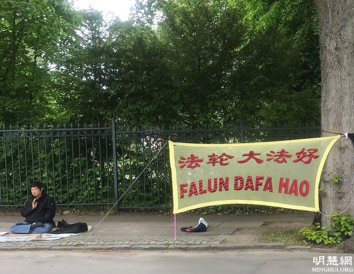 | 【明慧网二零二一年七月十六日】(明慧记者舒慧丹麦报道)十八年前的一天,年轻的中国女子小颖怀抱着不满周岁的女儿走进丹麦哥本哈根中使馆,为孩子办理护照手续。递交材料后,使馆经办人问:“你丈夫是干什么的?”她回道:“在外头坐着的那个就是。”看到使馆大厅里摆放的污蔑法轮功的资料,她说:“你们这些资料都不是真的,你们还敢往这放?” 小颖指的“外头坐着的”,就是在中领馆前静坐着,前来表达“停止迫害法轮功”诉求的丹麦法轮功学员,其中有小颖的丈夫朱学智先生。十八年过去了,现在每个工作日,法轮功学员依然前来静静地表达他们的诉求。朱先生和其他法轮功学员为什么选择在中领馆前静坐?十八年里他们都经历了什么呢?  图1:朱学智先生在中使馆前表达必须停止迫害法轮功的诉求 |