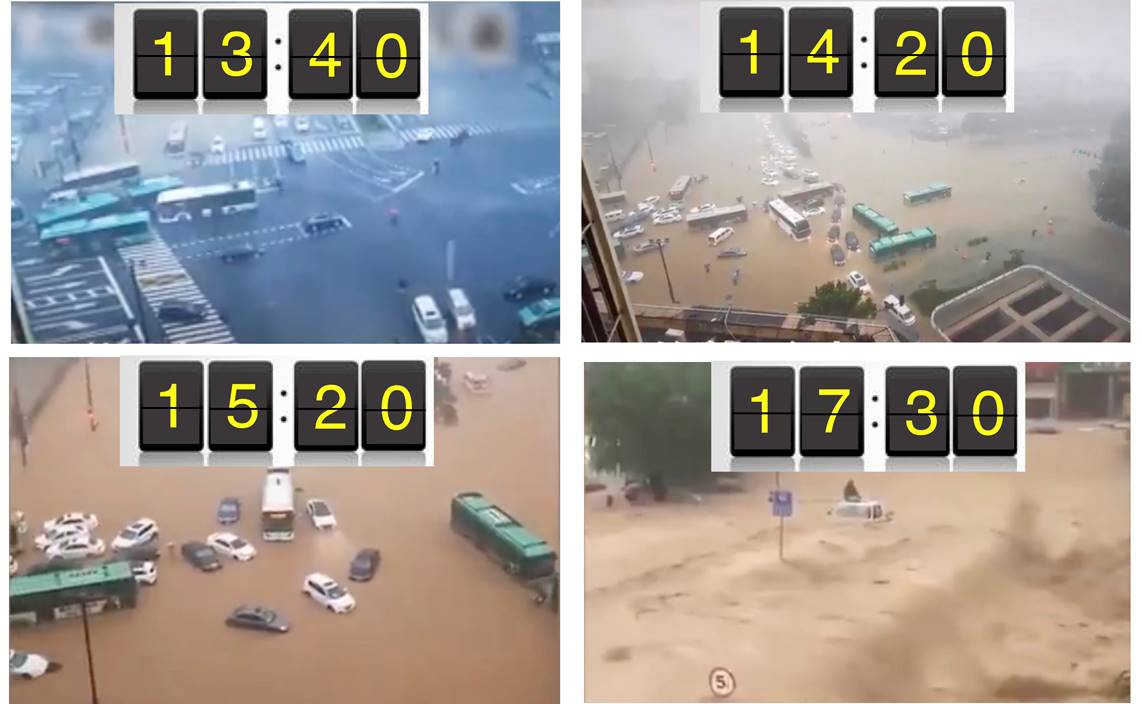 | 【明慧网二零二一年七月二十三日】7月20日是法轮功受迫害的日子。无独有偶,今年的7月20日,河南郑州遭遇了一场罕见的特大洪灾,整个城市被湍急的大水肆虐,给“720”再次增添了血和泪。 近日郑州市民众上传的视频显示,黄浪冲走了民众和车辆,淹没了京广路的隧道,并倒灌地铁,将仍在运营的列车快节奏吞噬,大水漫过了众多游客的胸膛,还有那掉入塌陷的深坑的民众,以及被大水席卷而去的父子…… 洪水退去后,遇难者的尸体横卧在街头、地铁站,大量翻倒的车辆横七竖八地堆积在马路上,还有众多车辆仍处在被淹没状态,狼藉之状宛如经历过一场战争。此次洪水造成了难以估量的民众的生命和财产损失。 尽管郑州特大灾难登上了诸多国际媒体的头版头条,但中共各大官媒却极力回避,例如,中共央视、河南卫视等仍事不关己、歌舞升平,聚焦欧洲洪灾、并播放“抗日神剧”。而党媒《人民日报》虽在第七版提到了河南洪灾,却强调“河南强降水,多地多部门采取应对措施”,传递着满满的所谓“正能量”。 与此同时,中共官媒清一色的都将郑州的灾难归咎于上天,特别是中共河南当局刻意夸大降雨规模,称特大洪水 “千年一遇”,更甚者“五千年一遇”。然而,越来越多的证据显示,这场洪灾更多来自人祸。 郑州水位迅速暴涨、黄浪湍急——有何蹊跷? 21日,网上传出民众实拍的郑州洪水发展过程的视频。从视频画面可以看出,20日下午1点40份,郑州市中心雨势虽大,但路面上并没有什么积水,车辆仍然在行驶正常(图一,左上)。然而,在短短半个多小时的时间内,郑州市中心整条马路突然间被洪水淹没,到2点20分,路上较高的积水已经导致一些公交车失灵(图一,右上)。  图1:2021年7月20日,郑州市民实拍的洪水发展,水位在半个多小时内突然暴涨,水流湍急。 |