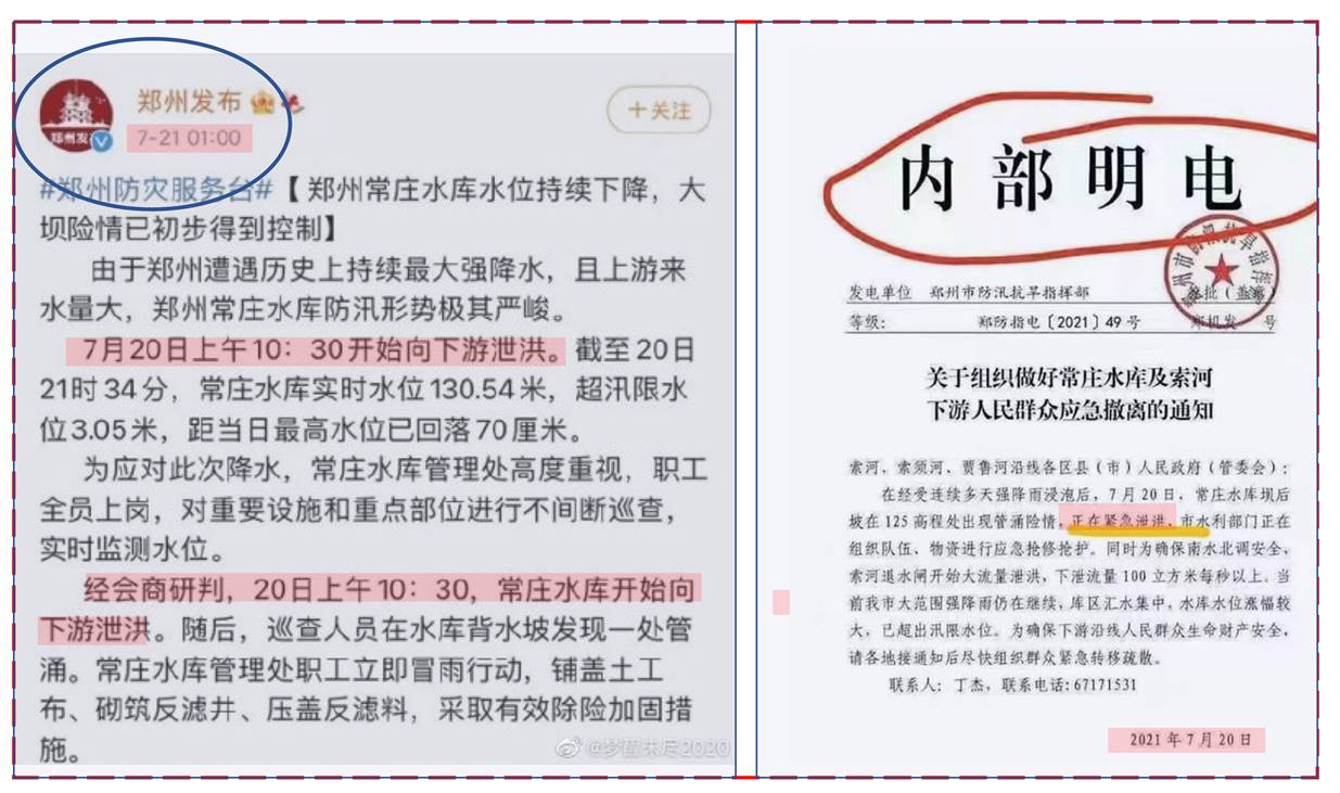 又过了一个小时,3点20分的时候,郑州市中心几乎已成汪洋,被淹的全部车辆都失灵(图一,左下)。5点半的时候,整个郑州市都被洪水肆虐,路上不断有车辆和人被激流冲走(图一,右下)。 从网络上传出的多个视频中都可以看出,郑州市洪水流速很高,有长发女士、父亲以及孩子在大街上被冲倒,无法站起来,迅速被卷走,而大量车辆也被湍急的黄浪冲得横七竖八。此情此景根本不像是中共党媒所宣传的“内涝”,而更像是黄河改道、水库泄洪造成的洪灾。 身处平原地带的郑州四面无山,地势平坦,即使降雨量大,也都是水势从下往上逐渐累计,造成内涝;然而,市区突然出现很高的洪水,并且迅速暴涨、水流湍急,那往往只有泄洪的时候才会出现。 的确,到21日早上,市区大部分洪水退去,很多街道都看不到多少积水了。这种来去匆匆的特点,也不符合“内涝”的特点,而更像是个“不速之客”——泄洪导致的洪峰过境。 “无预警泄洪”——官方通知洩中共草菅人命 果不其然,网络上爆出的中共官方通知,佐证了中共的“无预警泄洪”。 21日凌晨1点,中共郑州宣传部门的官微“@郑州发布”发文称,“由于郑州遭遇强降水,且上游水量大,郑州常庄水库防汛形势严峻,20日上午10:30分开始向下游泄洪,截至21时34分,水库实时水位130.54米,超汛限水位3.05米,距当日最高水位已回落70厘米。” (图二,左)。  图2:2021年郑州洪灾,中共对民众“无预警泄洪”、对体制内部通知到位。 |