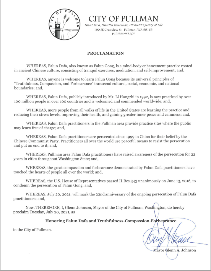 普曼市褒奖状译文如下: 普曼市褒奖鉴于,法轮大法,又称法轮功,源于中国古老传统文化,是一种健益身心的功法,集安静祥和的动功、打坐及自我提升于一体;且 鉴于,任何人都可学炼法轮功,因其真、善、忍的普世原则,超越了文化、社会、经济和国界:且 鉴于,法轮大法由李洪志先生于1992年公开传出,现弘传百余国,有上亿人修炼,受到全世界的欢迎和赞扬:且 鉴于,美国各行各业越来越多人在学炼法轮功,可以减压健身、获得内心安宁与平静;且 鉴于,法轮大法修炼者在普曼地区提供炼功场地,公众可免费学炼;且 鉴于,自1999年以来,法轮大法修炼者因其信仰在中国遭到中共的迫害。世界各地的修炼者用和平的方式抵制迫害、结束迫害;且 鉴于,普曼地区法轮功学员22年来提升了华盛顿州各市对迫害的认知;且 鉴于,法轮大法修炼者展现出的洪大慈悲和坚忍感化了全世界人民的心; 且 鉴于,美国众议院于2016年6月13日全票通过了H.343议案,谴责对法轮功的迫害;且 鉴于,2021年7月20日是法轮大法修炼者持续反迫害22周年; 因此,我,格兰·约翰逊,华盛顿州普曼市市长,特此宣布2021年7月20日,星期二,作为 普曼市崇致敬法轮大法暨“真、善、忍”的日子。